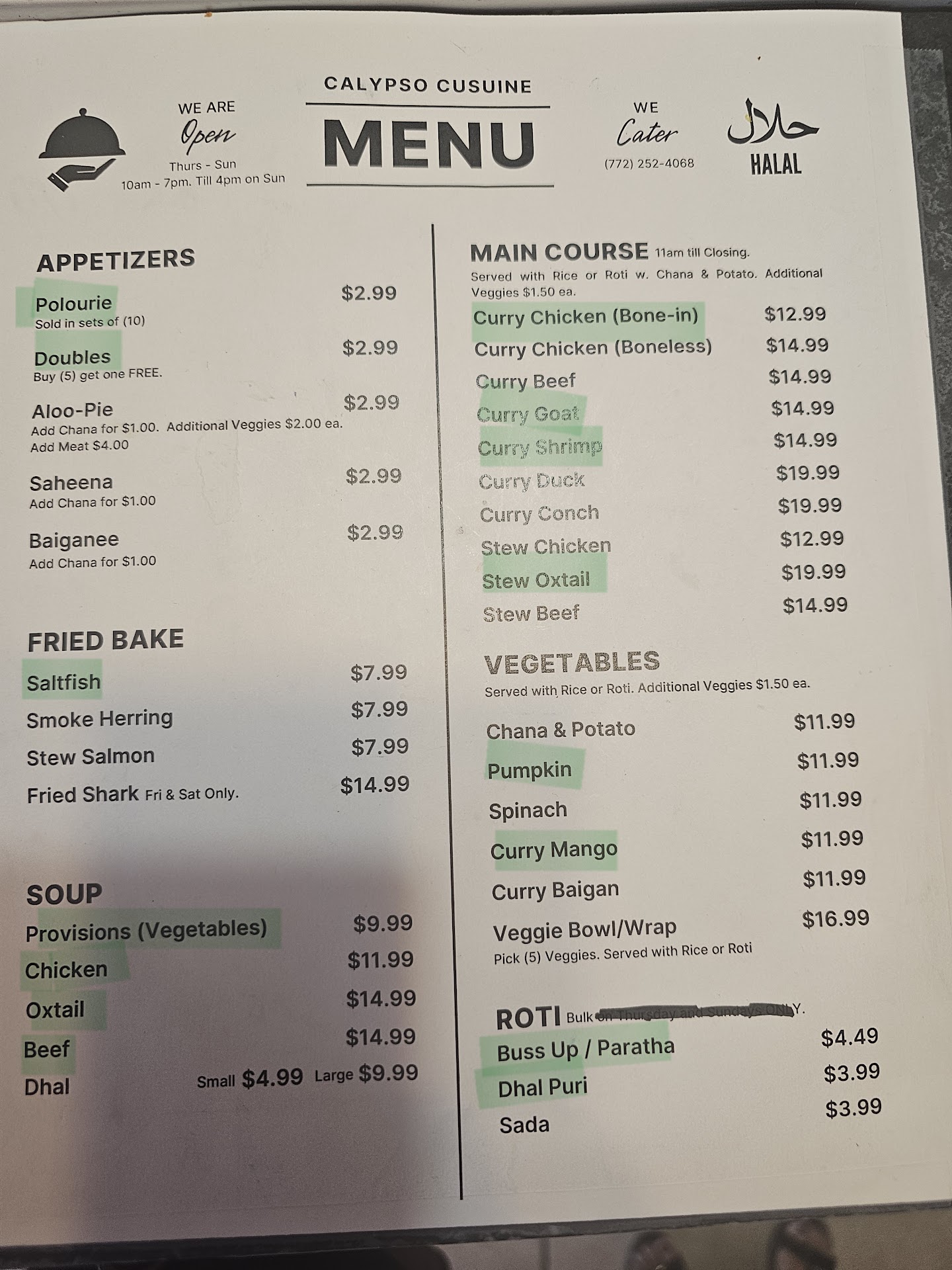 Calypso Cuisine moves up the list of Top Five Restaurants On The Treasure Coast to number three in the 2025-2026 edition, up from number five in the 2023-2024 edition; I am the food reviewer for both editions. Offering authentic food from the rich culture of the island of Trinidad, their food is very delicious, and always consistent, because Head Chef Savi prepares each dish. The goat curry is excellent, and a bit different than its cousins in Jamaican and Indian cuisine, in that it has a special mix of peppers in it that are unique and tasty. The option to have pumpkin on the side is the perfect sweet complement to the spiciness of the curry, and the way the pumpkin tastes with the curry is far better than one would expect from any previous experiences eating pumpkin. I always order my goat curry with a double side of pumpkin, and the basam chaat roti bread, which comes with it (although you have to specify that you want roti bread, when asked, and the type from the two choices available); the fresh house-made roti bread comes out so delicious, and even better when you dip it in the curry, as well as offering another balance to the spice. The only possible area of improvement would be if there were even more pumpkin. While the dish is spicy, the mix of peppers has serious healing properties; in my experience, it clears sinuses whenever congested, and once cleared an ear clog from swimming that lasted several days and seemed that it would require a trip to the doctor to clear. The restaurant does not have servers, and food is picked up at the counter. Improvements since our last edition are that the television was off, and the pop music was replaced by authentic music from Trinidad, but the volume could still be a bit lower.