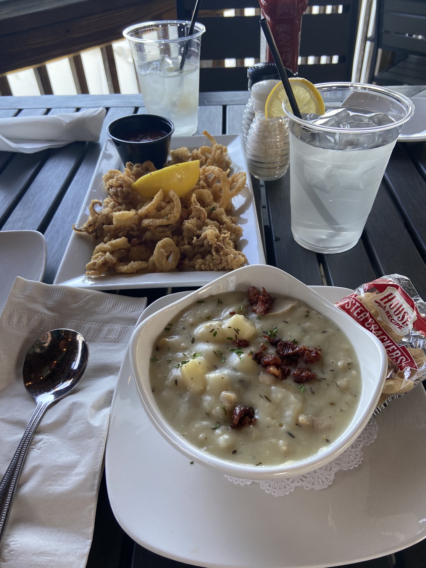 Food: Ordered a cup of clam chowder & calamari to start. Both were pretty good. For our main meals we had the blackened blue burger & the crispy fish sandwich (haddock). The French fries & homemade chips were delicious sides, however the sandwich came with dry bread, no sauce, butter or anything on it besides a small side cup of tarter that was barely enough to smear on the sandwich. The size of the fried haddock was decent and the batter was crispy. The burger was a little more on the greasy side but the flavors were there & was cooked medium rare as asked.