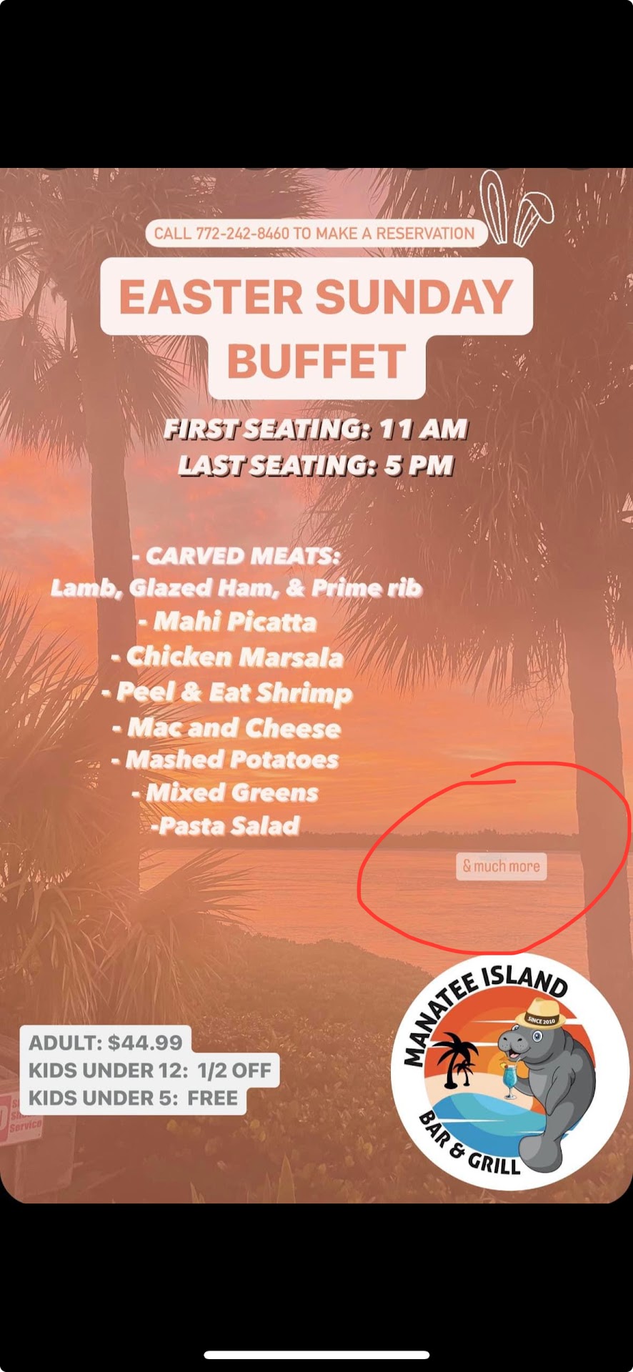 Read moreThree of us went for the Easter Buffet and were extremely disappointed and felt ripped off. Their ad said “& much more” to the little that was listed in the picture below, but “much more” that I can remember additionally was corn (seemed out of a can), cheap rolls, and the choice of four very bad tasting cakes (carrot, coconut, German chocolate, and lemon). They also failed to mention in the ad that they would add a 20% automatic tip which was $10.60 for my bill alone.