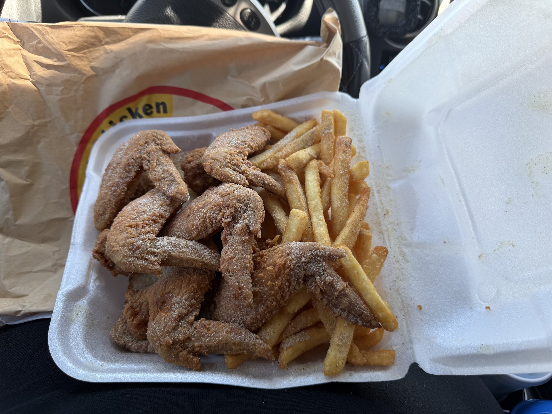 I ordered a ten piece dark chicken with fries and a ten piece whole wings with fries, the wings were absolutely amazing, definitely a 10 out if 10, very fresh and seasoned very well, even the fries were great, they gave us plenty of sauce for dipping as well. Service was very fast, we were in and out in about 7 minutes.