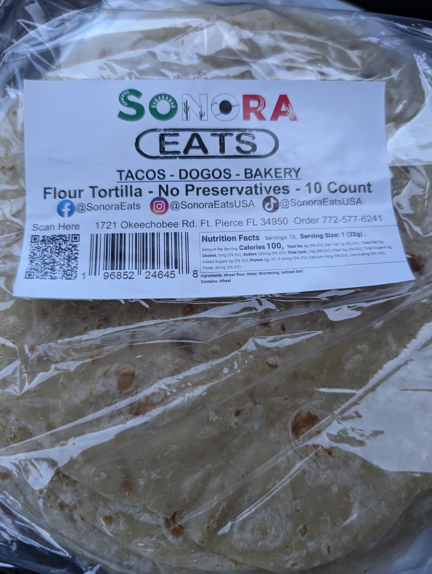 All right, being born and raised in Southern California if you live in Florida you understand the pain of not being able to find good Mexican food. .. actual Mexican food. Look no further, if you were accustomed to eating at Roberto's or Adelbertos or whatever your favorite taco shop was, you will find that here. This is family run with aubelita in the kitchen cooking all the food fresh and ready to order. They have a variety of horchata, and Mexican plates and burritos. I'm šÆ positive that if it's not on the menu, they will make it for you. The red sauce was perfect in flavor and yes it's called red sauce, not taco sauce. I had the machaca and eggs plate for breakfast, and the carne asada street tacos for lunch. The pico was delicious and the beans were so good that I gobbled them up, and I don't even like beans. They weren't dry, and pasty, they tasted very good and had the perfect texture with a sprinkle of cotija or panela. Other than the delicious food here I bought 3 packages of house made tortillas. Which they can make custom sizes. Something I've been looking for, for a while now. Since we struggle to find a real Mexican taco shop here we have to make our own carnitas burritos, carne asada burritos, Cali burritos etc. And it's super hard with the tiny store bought tortillas, so ordering their large tortillas will make that easy from now on. I miss the Mexican lady on the street corner selling fresh tortillas with melted butter, but Sonora Eats gives me hope that I have finally found the Mexican food I've been looking for. I'll update with photos as I try more entrees, please support this locally owned family Mexican taco shop, they also told me that they are at a farmers market in downtown fort pierce on Saturdays. Quick note, the tortillas are so good, you'll regret not buying two bags. Don't just get one, it will be gone before the next...