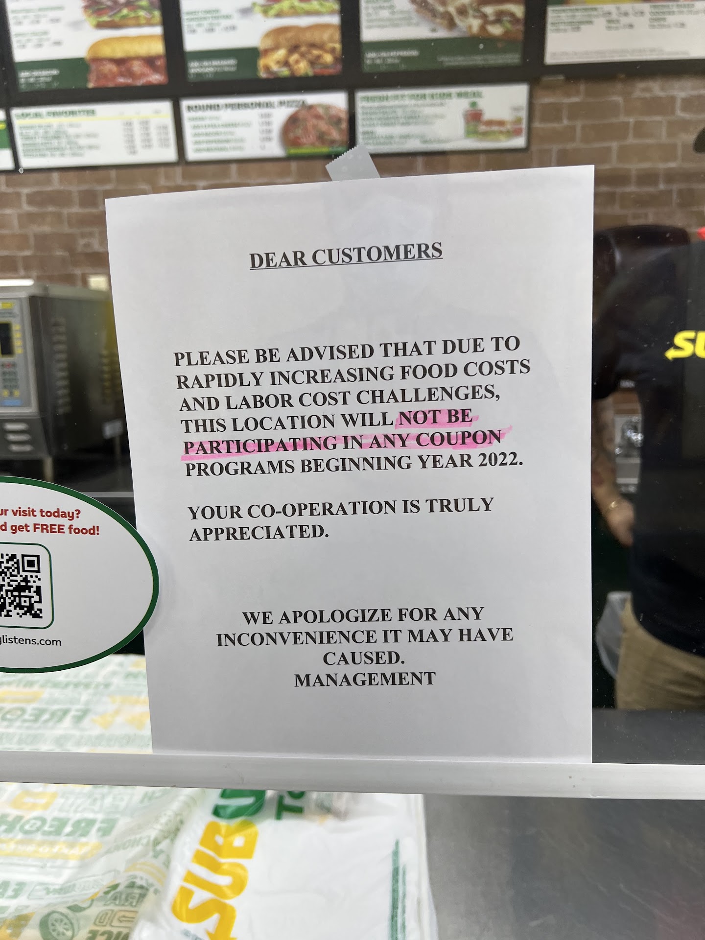 Read moreI never write reviews but I simply had to. I wanted a couple of sauces on the side instead of the sandwich since it was going to be eaten later. $1 per sauce, two little scoops of chicken on a footlong, and the bread was hard on the ends. No other Subway has ever charged for putting the sauce on the side. The worker herself mentioned the owner has too many rules and this isnât like the normal subways. This current...