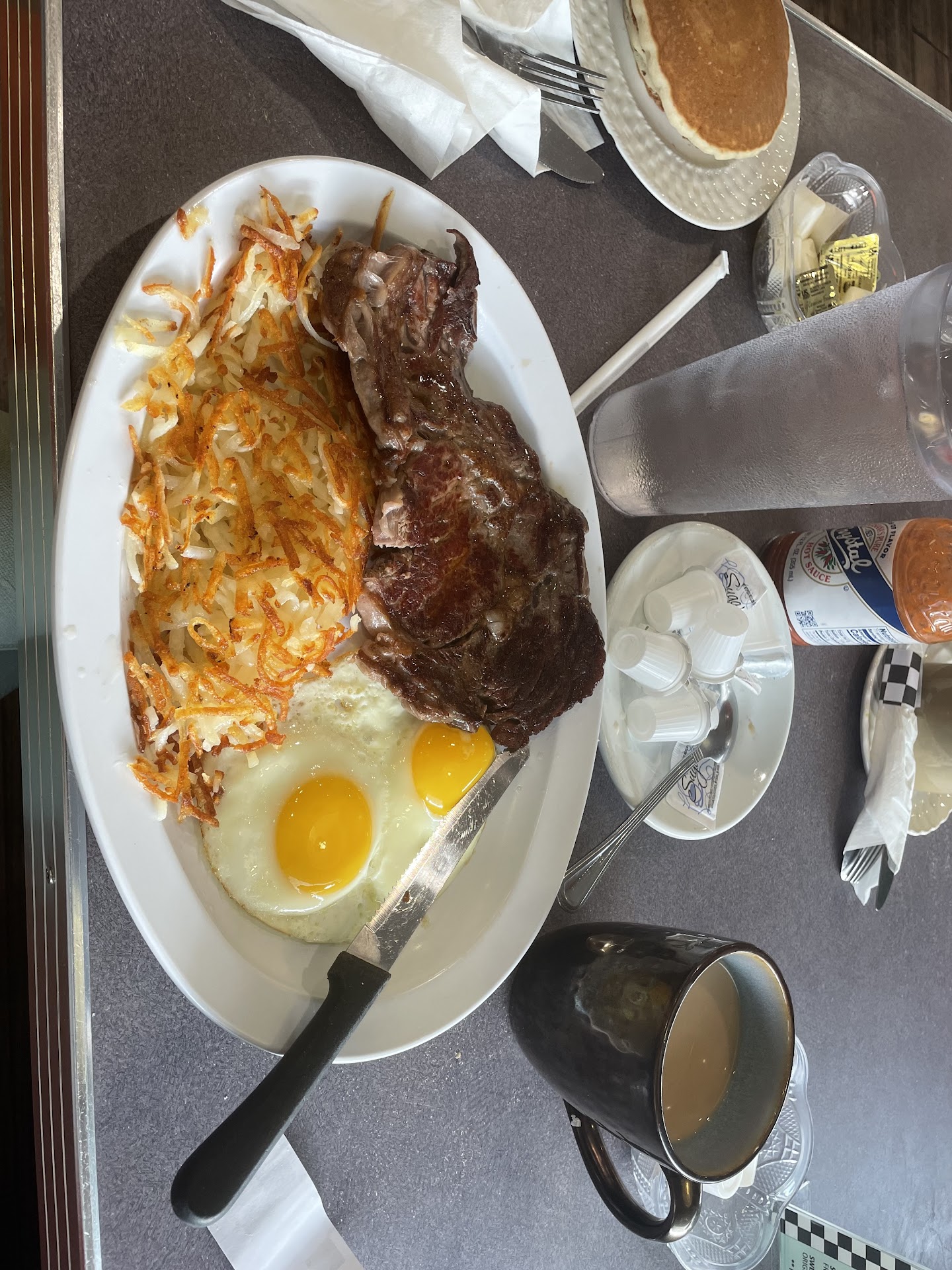 I ate with my family of 3: me, my wife and our 3-year-old. We arrived near noon, but were handed a breakfast menu. Not a big deal to me, but reading the menu from Door Dash gives me the impression that the full menu (which includes other traditional diner food) is available all day. If that's true, I would have liked seeing it. We were seated quickly (around noon on a Friday), and our drink order was taken before we were even seated. While this seems very hospitable, there was an air of brusqueness and hurry that I didn't appreciate. Indeed, a sign that says "sit down, eat, and get the hell out" would not be out of place. (Though I didn't see a sign that says that.)