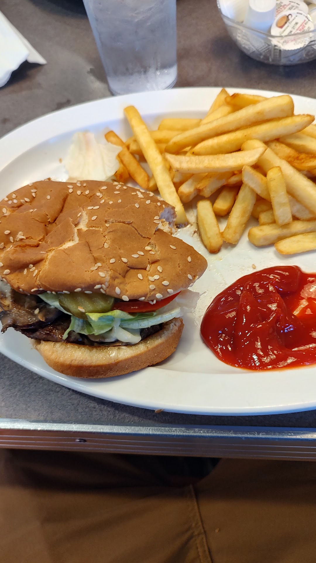 I had hamburger with swiss & shrooms + fresh lettuce/tomatos/onions (score 5 of 10), French fries (fresh & crispy normal 6 of 10), and a large sweet tea (my taste buds said not brewed unfortunately, but not terrible, so 3 of 10).