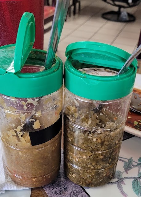 Then there are these repurposed flip top Parmesan cheese containers (think Kraft Parmesan cheese bottles.) There are one or two of them on every table filled with a nasty looking sauce concoction. The top of the bottles are open, and they have a spoon stuck in them to serve yourself up whatever that is inside. You would have to be a brave soul to actually use the sauce. I’m surprised this gets past the...