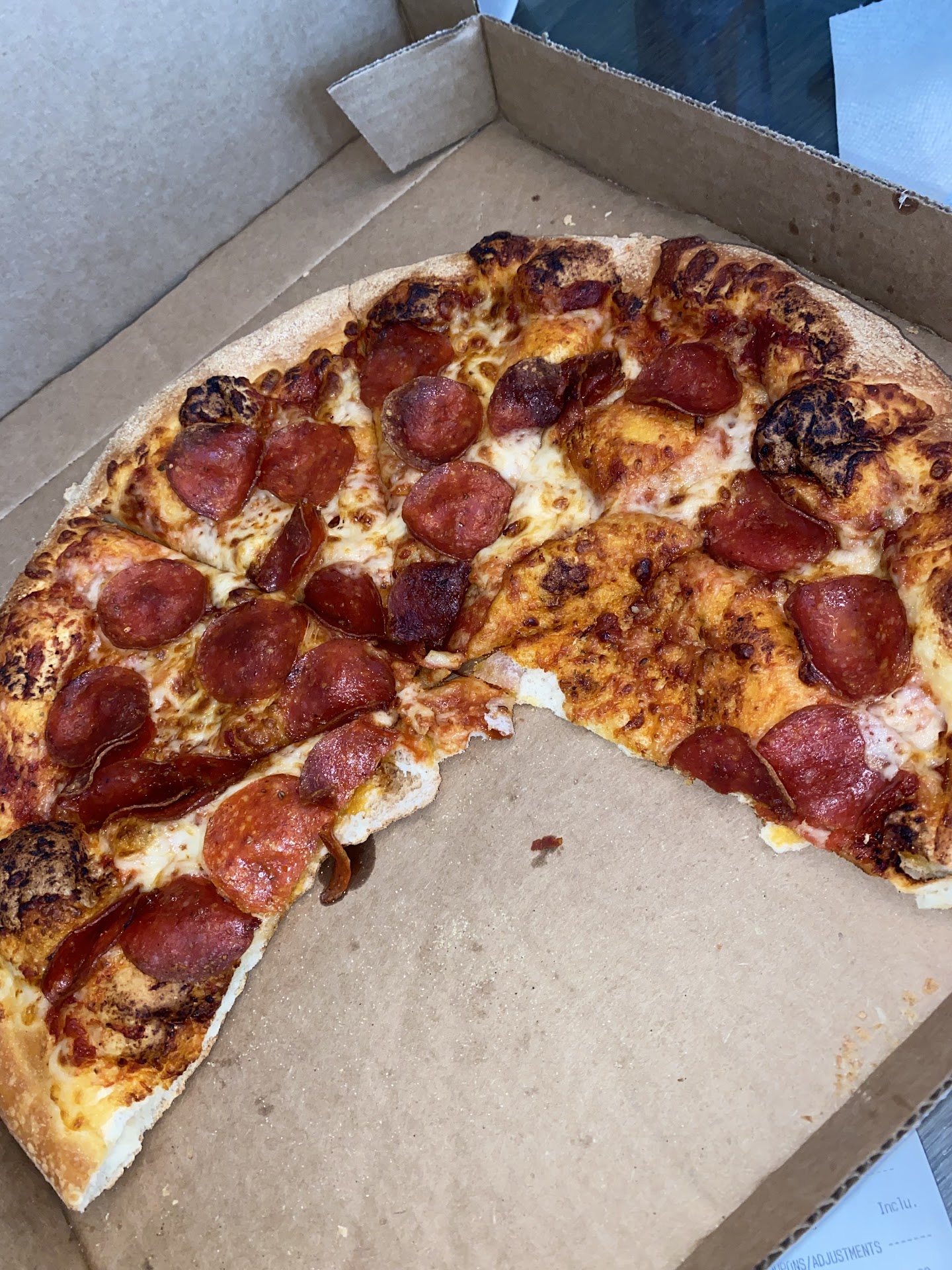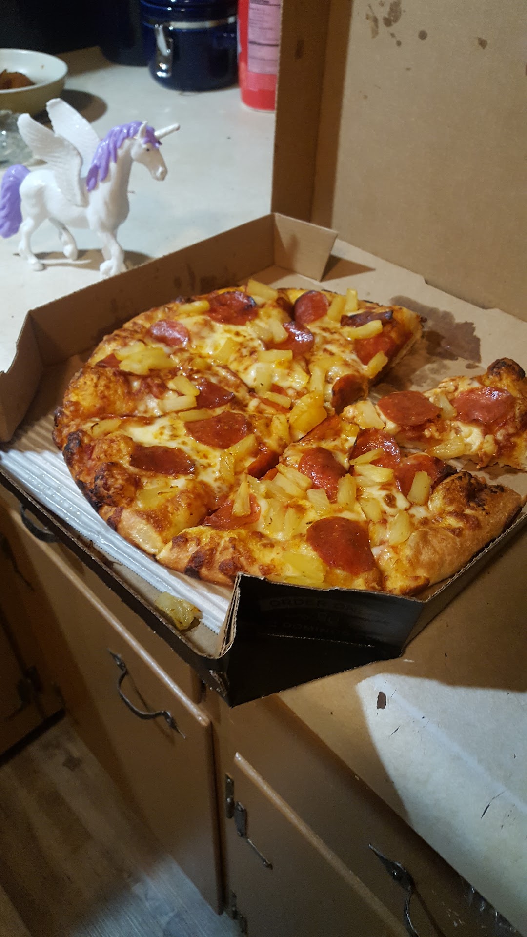 Ā Ā Ā Read moreEvery now and then, on an unlikely Friday night, when everything possible has gone wrong, something amazing happens. The perfect Pepperoni Pineapple Pan Pizza happens. That beautiful black box always makes me feel a little better, but the absolute joy I felt when I saw what had been made for me was unexpected and shocking. Not only was it a delight to look at (perfect pineapple/pepperoni ratio, as per teenage boy), it was absolutely delicious. It was the best pizza I've had in years. And I'm a horrible cook, so we eat a lot of pizza. I'm tempted to order desert and see if lightening can strike the same...