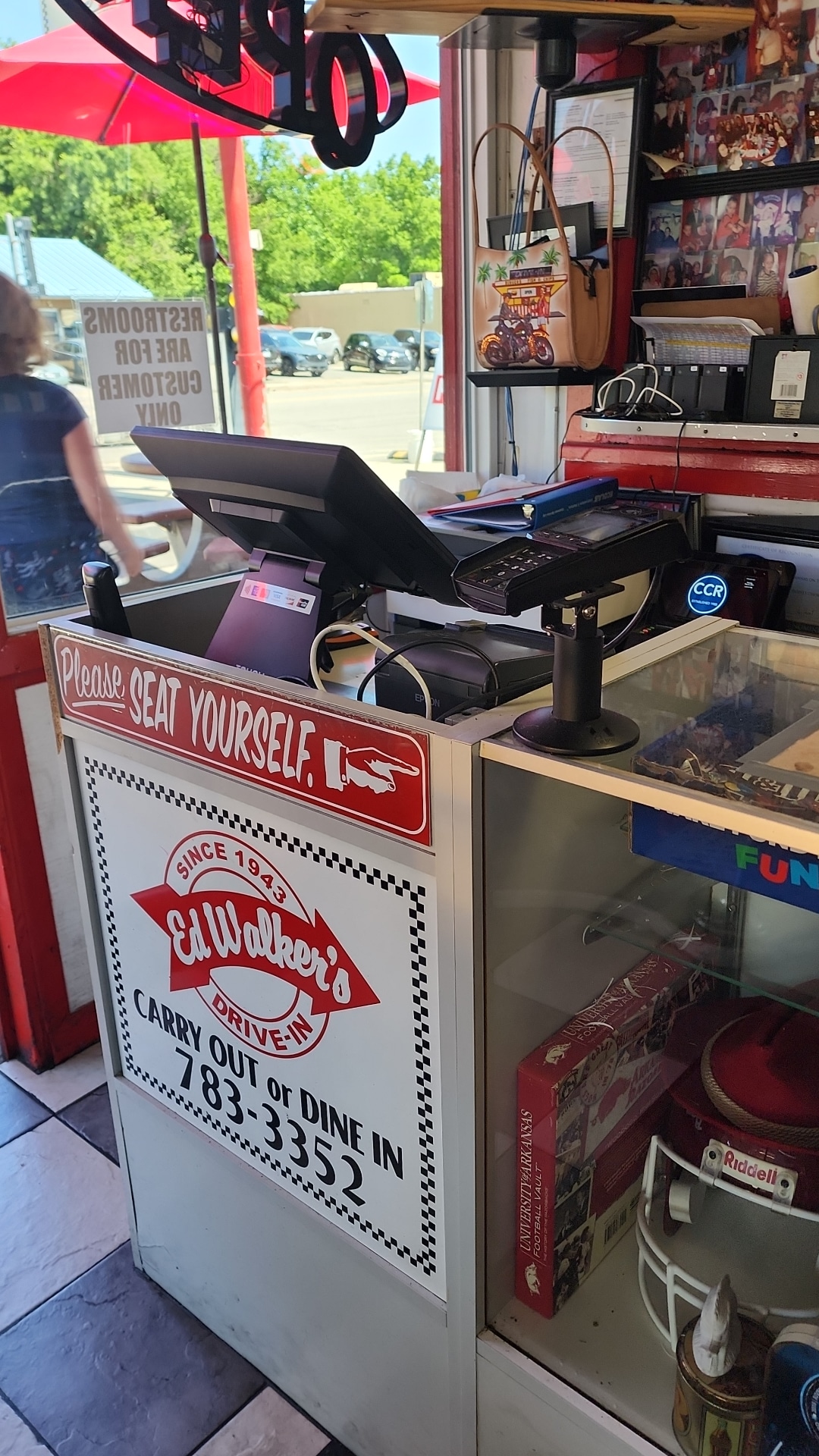 Read moreFun old school drive-in in Ft Smith. Definitely a must try and was recommended to us by the locals. You can get takeout, eat outside, or they have a surprisingly large inside area to eat with many tables and booths. Inside you seat yourself, and a busy server comes by with menus. It's very "classic diner" service wise. The server did not make small talk, did not make recommendations, and seemed rushed every time we saw her. But she took our order and brought refills. But little things like only bringing 3 napkins for 4 people and not giving forks with the meal made us have to keep asking other servers for things. However, once we had our food and she left the ticket, we never saw her again to get refills, napkins, or order dessert. We ordered their "world famous" French Dip (add cheese) and the Hot Mama jalalpeno burger both with curly fries. My daughter got the Amy's All in One, which was a messy open face burger with fries and gravy on top. I added on a bowl of chicken and dumplings soup as an afterthought, and it ended up being my daughter's favorite! We also got a slice of raspberry cheesecake at the end which was tasty. The food was quite good. The beef sandwich and soup were our favorites. It was classic diner fries and greasy food but done well. They have homemade sauces (I got a side of Roquefort for my fries), daily blue plate specials (even though no price was posted), and homemade chili and soup. Desserts are also plentiful and around $3-4, which was pretty affordable. Lots of fun Elvis and Marilyn photos on the wall and cute photo ops inside and out. We would definitely stop by again and maybe give their 5lb burger a try (split with the...