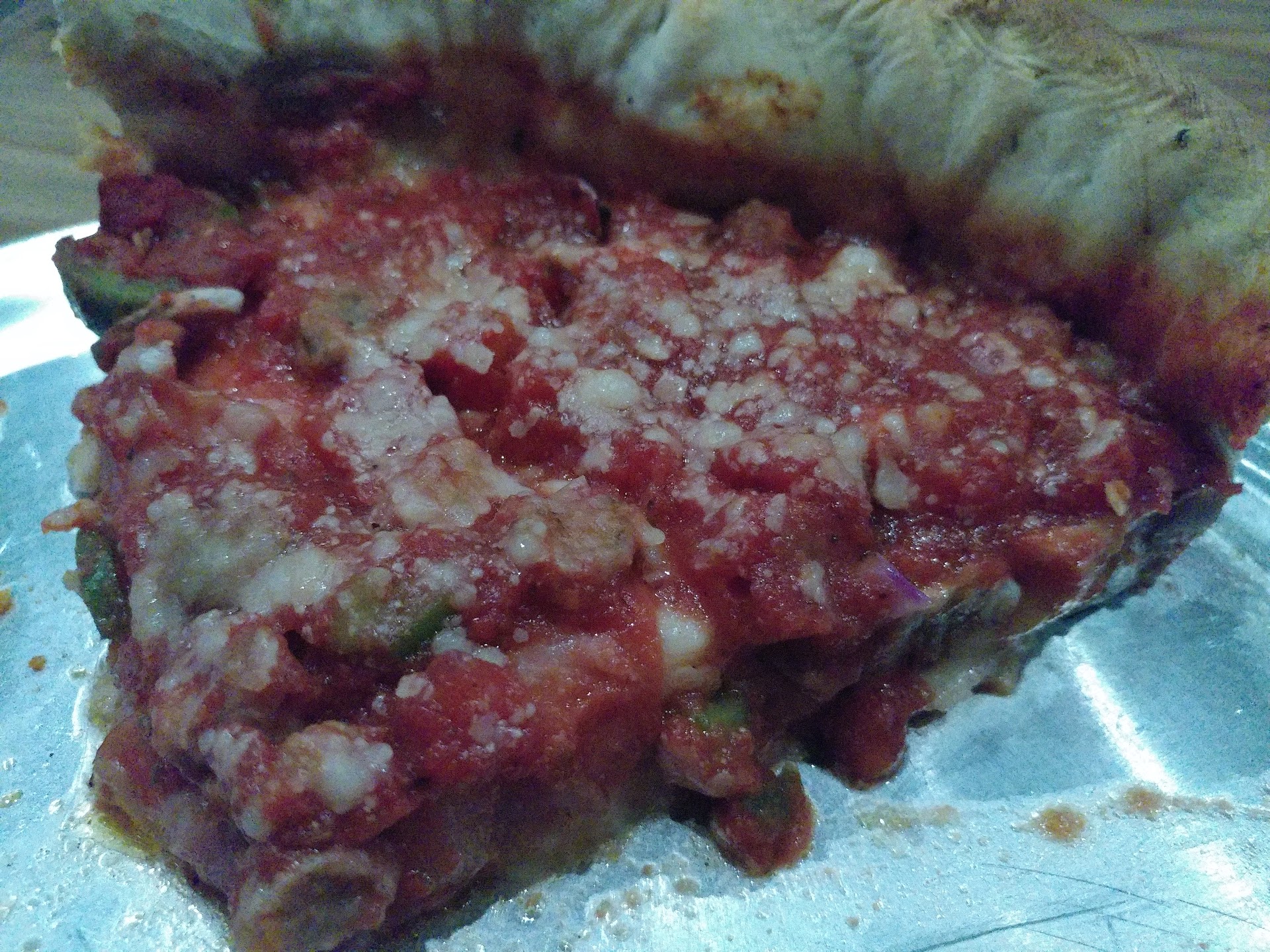 For pizza, we ordered two 9-inch Chicago-style pies: One was the "Leif Erikson", and the other was a Deluxe with fresh jalapenos added to it. The pizzas arrived hot, and we're piled with ingredients. The crust itself is relatively thin and crispy (which I really like), and the sauce is very rustic and flavorful.
