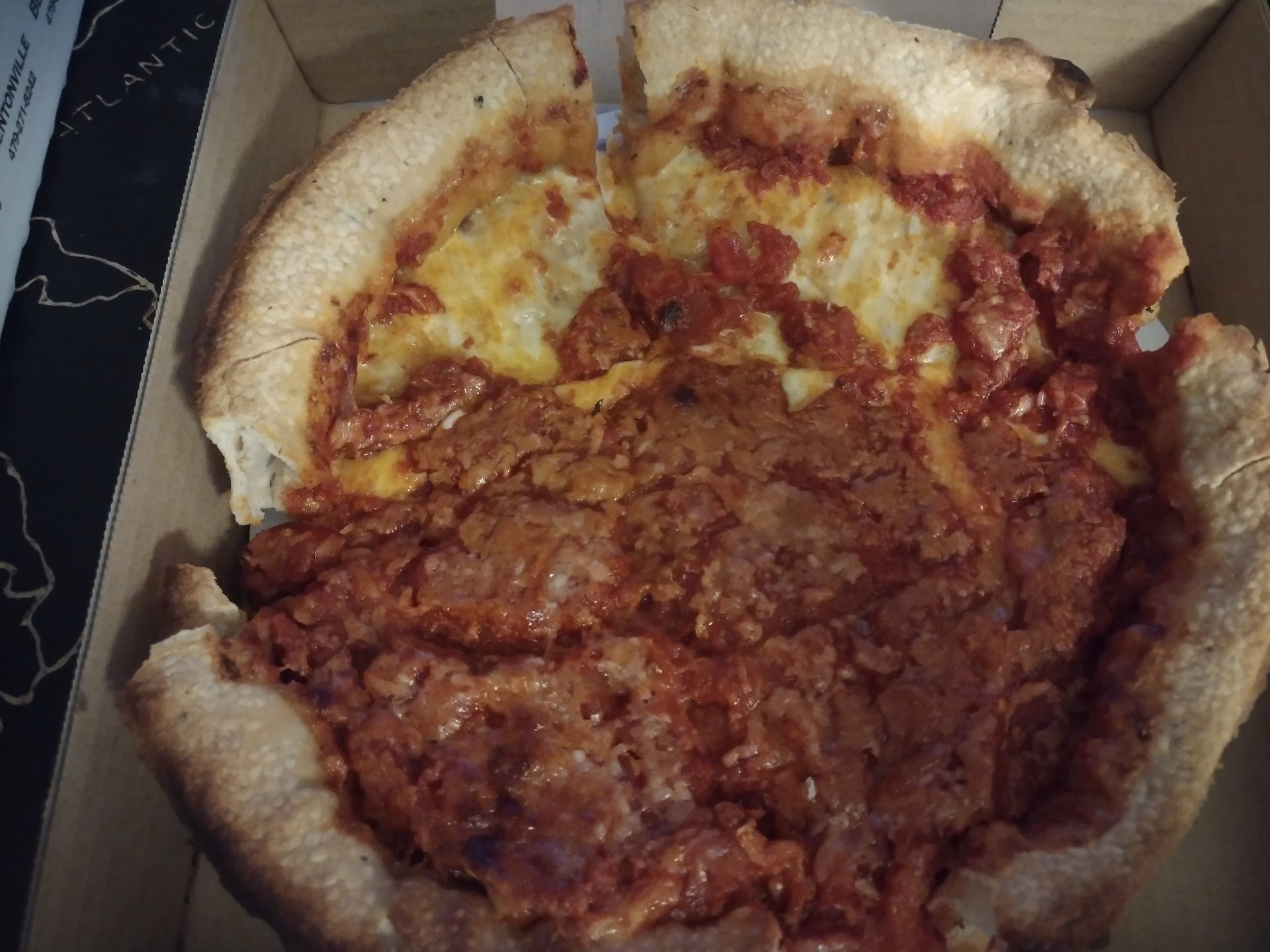 Read moreI ordered a pizza delivered through door dash. This was my first time trying or even seeing a "Chicago style" pizza so I had no clue what to expect. My first thought on opening the box was "is this even mine?". I had ordered a cheddar cheese chicago pizza. What I received looked more like a sausage pizza so I grabbed a fork to drag the large meaty looking bits off. I guess it was just a really chunky pizza sauce and seeing it on top of the cheese was a bit of a shock. The crust (outer edges) was rather hard and dry. Usually I eat all of a pizza, not discard the edges. The middle part had a good taste to it, but it really looked horrible. Though as this was delivered that might be the issue. Perhaps it got turned or shaken on the way to my house and most of the sauce ended up on one side of the pizza. Good flavor, but bad presentation... Probably looks much better for dine in.