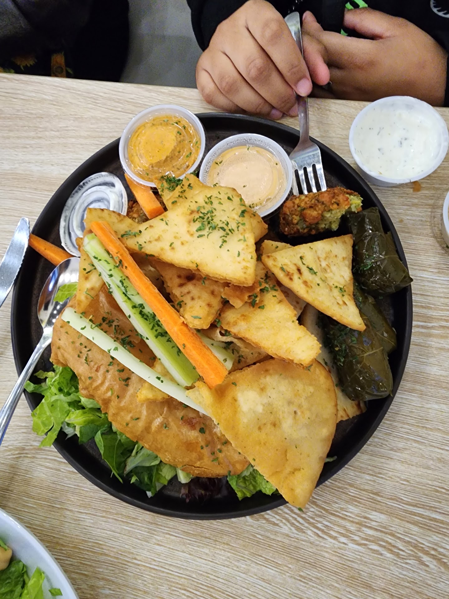 Read moreFood was really good. I ordered a salmon platter with rice and cucumber tomato salad as my sides. The salmon was cooked well, perfectly crispy skin but not overdone. Portion was a bit on the small side for $9 extra but the side portions were gigantic. I did wish the pita bread was more robust and warmed more on the grill before serving - it's usually my favorite part of an eastern cuisine meal. The other dish ordered was a gyro and I didn't try it so I'm not sure how it was, but it was eaten! For dessert we had a baklava cheesecake slice - it was very good. The topping was perfect with the rich cake.