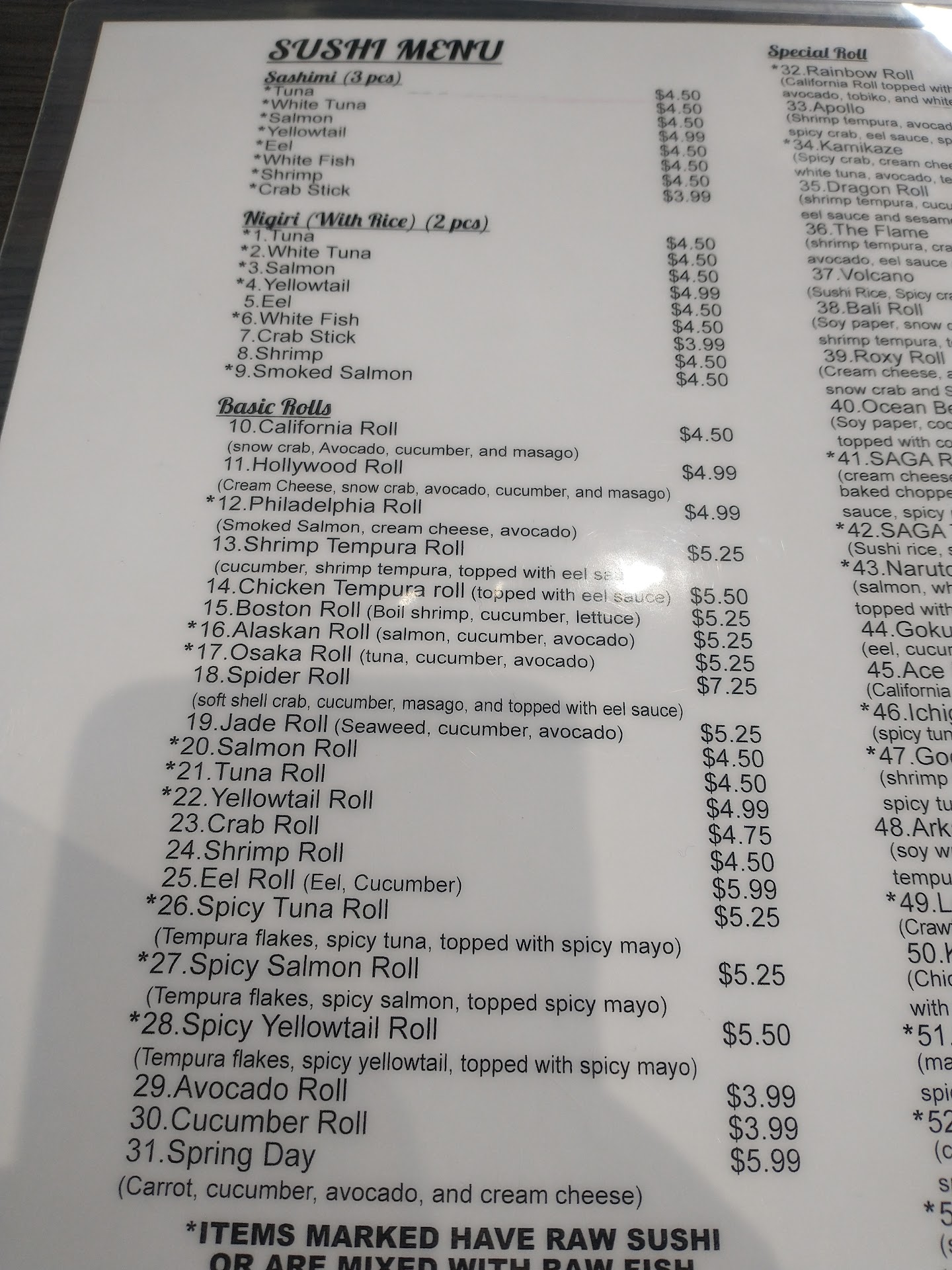 Third, the overall quality of food. Sadly, my only regret was not having a stomach big enough to try what I wanted. Sushi, hibachi, ramen, cuts of raw fish, appetizers oh my! Even the take home menu we received has just the sushi options on the front page!! (Three-ish pages respectively) I really was just not prepared to be overwhelmed by choices. In a good way!