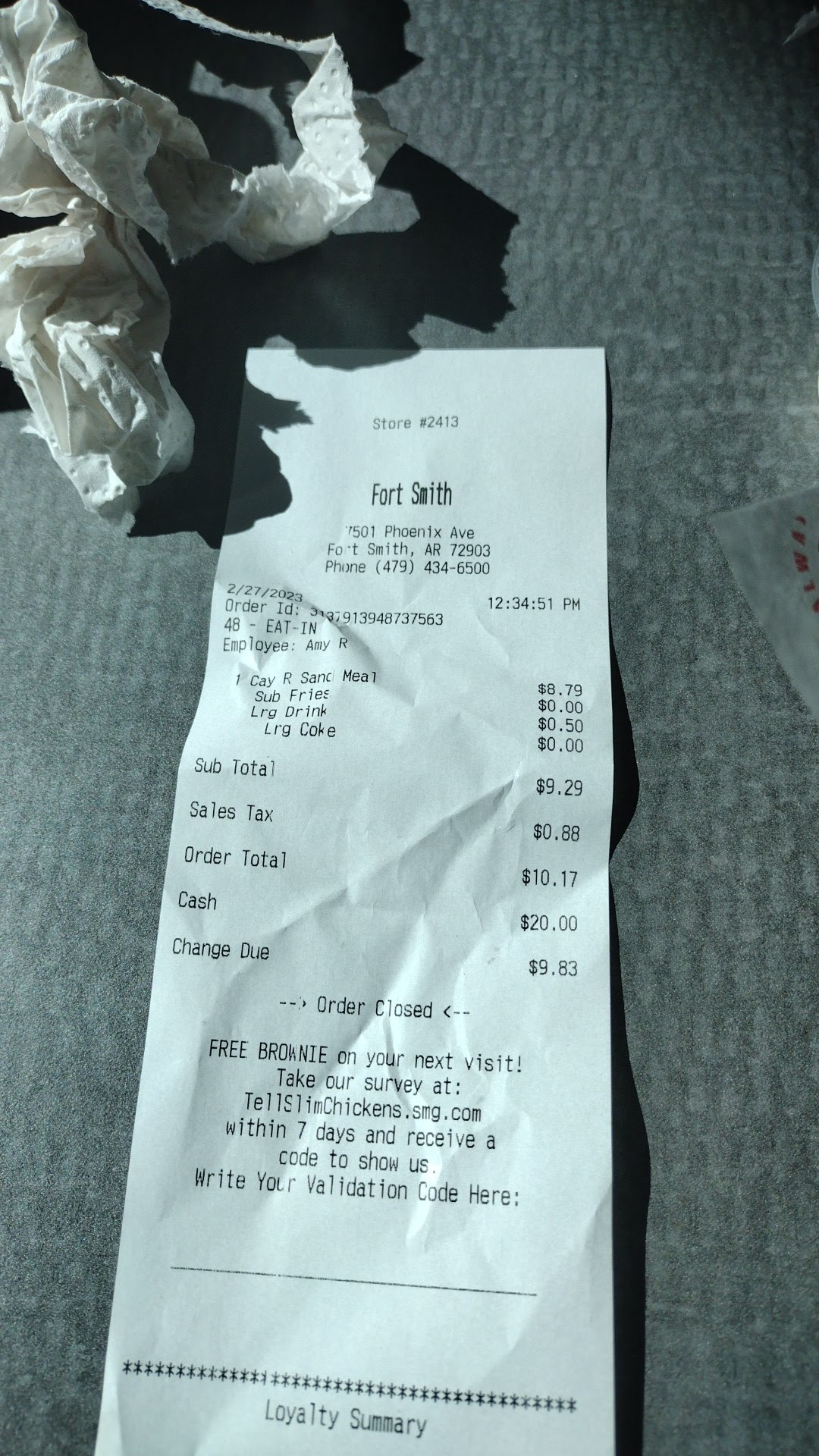 Read moreMyself and my roommate staying at a near by hotel tried this place out. Smelled good during the day and busy. One late night, we go to through drive thru and order crispy chicken sandwich meals. First when we pulled in I saw a bunch of teenagers that looked like they work there having a tiny party in the parking lot with friends smoking blunts. I know cause my window was down. The speaker on the menu board either needs to be replaced or the person needs to speak up. I was told that they are out of chicken patties and asked us if it was ok to use chicken tenders. I agreed. Pulled up to the window and waited for 20-25 mins before the guy came up with our bag and took our payment. The entire time while waiting, I saw other employees just horsing around, laughing, just cruising the kitchen like their own. Btw no hair nets...hats or type of uniform. You know when you were younger and had a job with customer exposure; the boss said "always look busy, don't stand around". Well I know now why we were told that. People like us. It does matter; interaction face value, confidence with the company and the people in charge of cooking your food, and customer service. We paid, got our order and left back to the hotel. We notice the tenders used were small and slapped on the buns that were small, barely any sauce mayo or Chayanne sauce on the other, the fries were cold. I tried some before we drove off. The burgers were small compared to what was illustrated on the menu. They broke apart easily and the tenders did not work. I did agree them to use the tenders however we still paid full price for the meals. Wasn't offered a discount or a gift card with credit on the next meal, nothing. And I hate styrofoam cups or styrofoam anything. The potato salad was the best I have ever had at a restaurant. It was so good, the bacon and the texture with that unique taste was amazing. Cookout winner there. This is the first time I have been to the restaurant and I don't see myself coming back. It may be just a job but it really does matter for the business. Slim Chickens was...