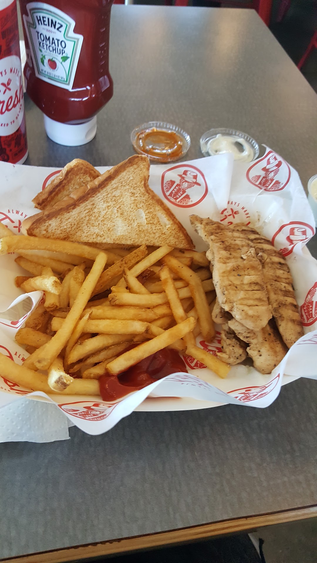 So I just got back from the place called Slim Chickens. I am in Arkansas on business and got in late last night to my hotel room . Looked on the TV and saw a commercial for a place called slim chicken. They stated good chicken using homemade, hand battered tenders. When I asked at the front what was close they happened to say Slim Chickens was right across the street. I walked down the drive and across the street to the restaurant which is located right outside of the airport entrance. I arrived at noon or shortly after and the place was quite busy. When I got up for the front door there were probably five parties ahead of me. One gentleman said " hope you plan to wait " . I had nothing else to do so I stood in line and chatted with another customer about what was good at this place. She rattled off a couple different menu items that her and her husband enjoyed at various times on their visits. When I got up to the counter I ordered the slim chick which was five chicken tenders, a side of your choice (usually fries unless specified), two pieces of Texas toast, 2 sauces and a drink for $8.69. I was delighted to hear that I could choose from either deep fried or grilled as I am a grilled chicken kind of girl.