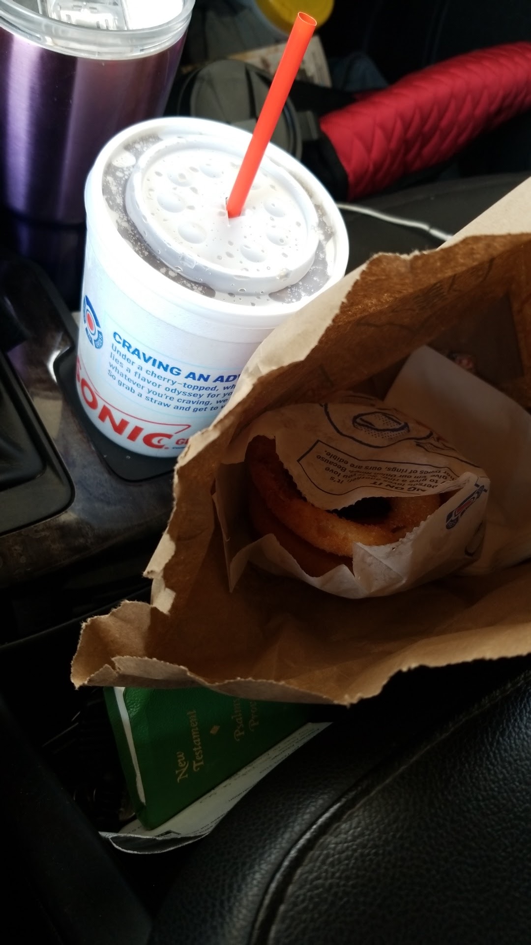 Read moreWe ordered two #2 meals. The Sonic double cheeseburger: mine with tots, husband's with fries. We dig the only fast food tots around and neither of these sides were overly greasy. As it should be. As always when ordering a double burger I regret my eye to stomach ratio, but then relax knowing I'll get two meals out of one dinner -grin-. Sonic is unknown in California, (I'm an ex-pat) and the tots, slushes, and heart thumpin menu of fried noms are a great treat. Rockin' carhops of all ages are normally fast to take your order. Carhops, and drive in restaurants, disappeared in the 70s out West. when I was a kid. Nice being able to enjoy the laid back eat-in-your-car vibe of back when