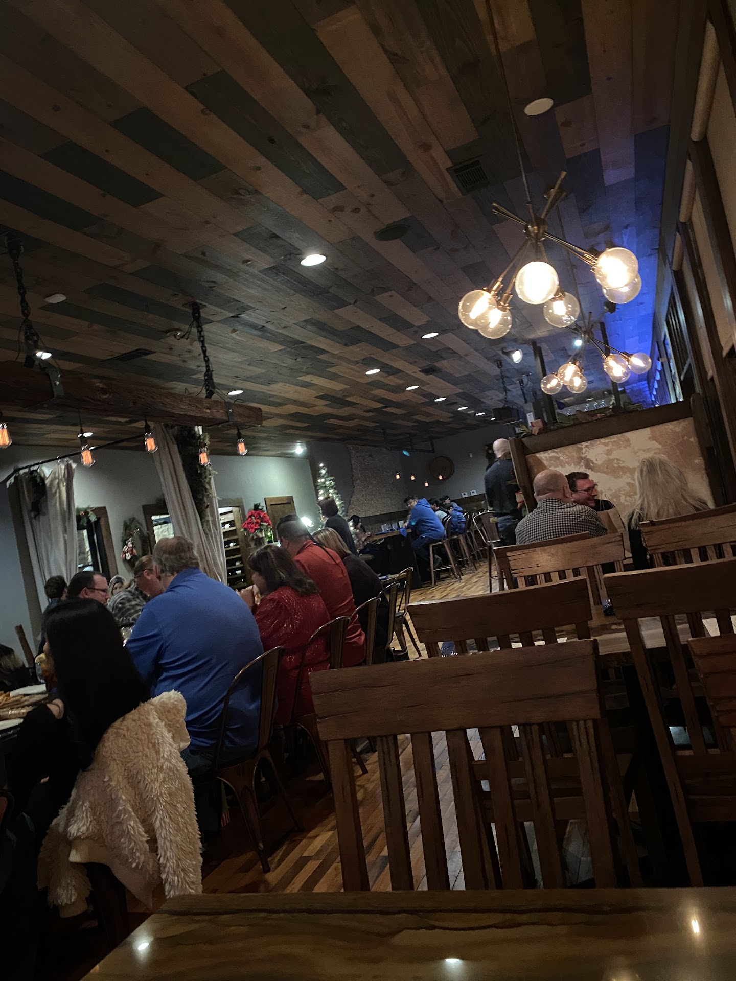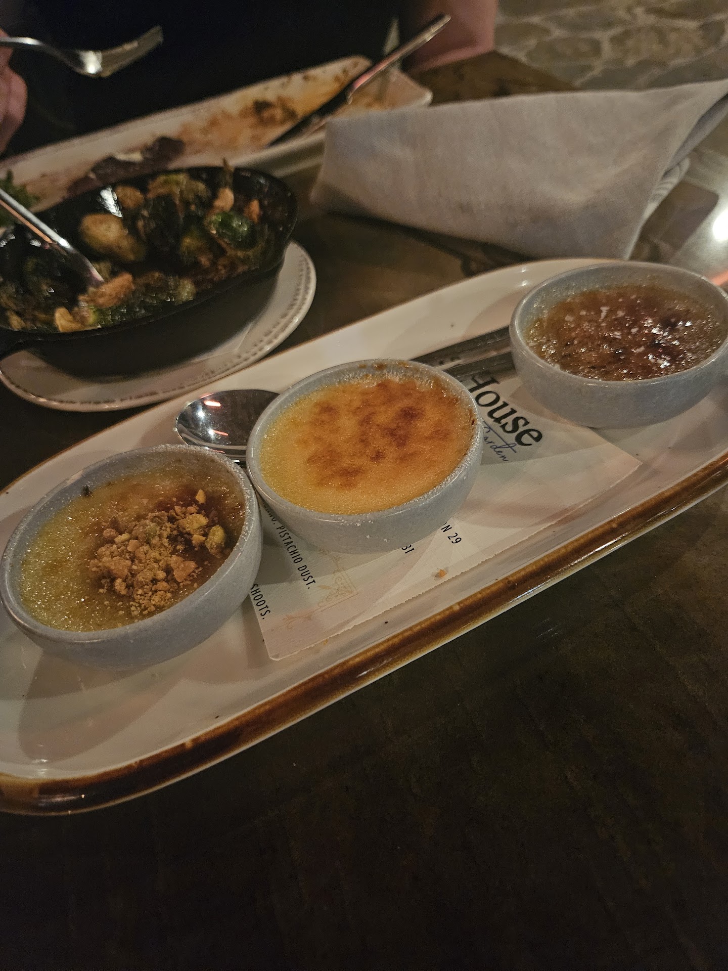 Read moreHad a lovely romantic evening at Stonehouse this weekend. We enjoyed the outdoor patio with heated lamps and string lights for a dreamy background to dinner. The signature cocktail was a grapefruit Paloma - and while a decent cocktail, it missed the mark for me on how a Paloma should taste. Too much extra grapefruit and too little zing from the Tequila. I was, however, very pleased with just how many gluten free and vegan options!there were! The butternut bisque was my starter, and while a tad thin - had great flavor, and I enjoyed the pumpkin seeds. My husband ordered the steak with a truffle butter crown. The truffle butter was not overwhelming with the truffle flavor, and he used a butterknife to cut - it was that tender and juicy. I got the seafood risotto (labeled GF) and demolished my plate. The risotto was creamy, good texture, and the shrimp was overall okay if just a tad overcooked (little tough to chew). The brussel sprouts (a la carte) were a shining addition to dinner with almonds(?) and perfectly toasted - more than enough to share portion wise. Dessert was the Creme brulee trio - the original was best, the caramel had a burnt aftertaste, and the pistachio lacked flavor - only the dusting of nuts on top gave it away as pistachio. Service was good, with a friendly and helpful waiter who took great care of us. I would argue the plates are a tad overpriced, however, the atmosphere and overall experience of dining here make it...