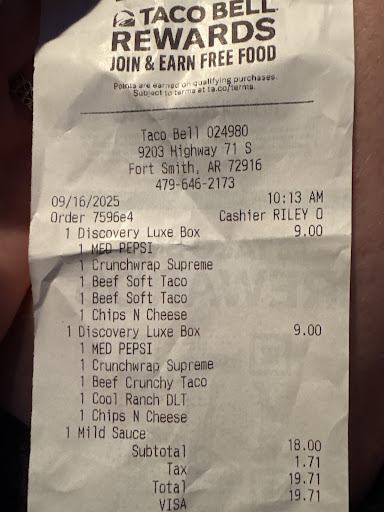 Read moreMy husband and I both got a discovery Luke box for $9 each! We went through the drive thru. After we had already got on the highway we tasted our Pepsi’s and it was nothing but straight carbonation there was no Pepsi taste to it! Then when we got home and started eating our Crunchwrap supreme it had no crunch wrap in it and the tiniest bit of meat in it! It was literally 2 tortillas folded together with vegetables and cheese! I’m not exaggerating when I say it had the tiniest amount of meat in it! Also the food wasn’t hot at all it wasn’t even warm hardly! For $20 I expect to get what I pay for not get ripped off! Service your soda machines more often and take better control on your food quality because we were highly disappointed! My husband is very seldom get a chance to be able to afford To eat out and we chose your restaurant! Shame on you Taco...