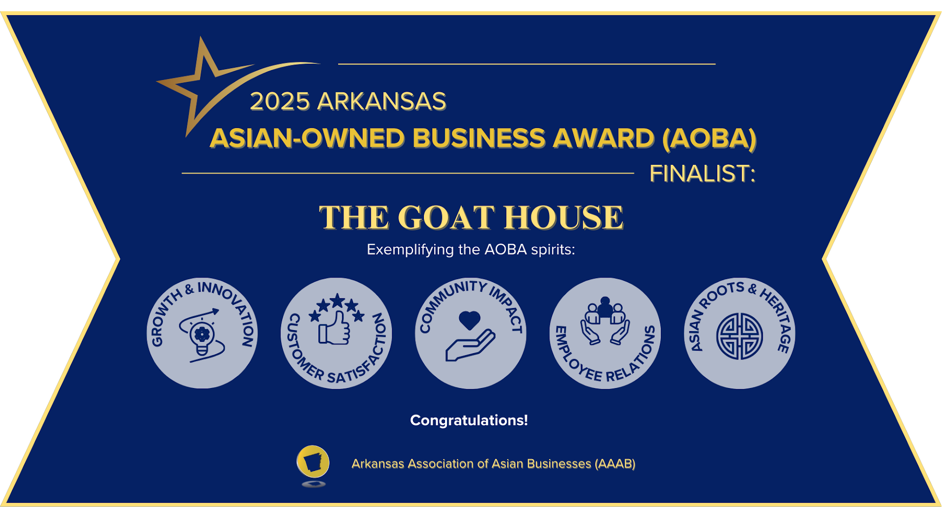 The Arkansas Association of Asian Businesses (AAAB) is proud to recognize The Goat House as a finalist for the inaugural Arkansas Asian-Owned Business Award (AOBA)! Congratulations to the entire team, and thank you for your outstanding business and service to...
