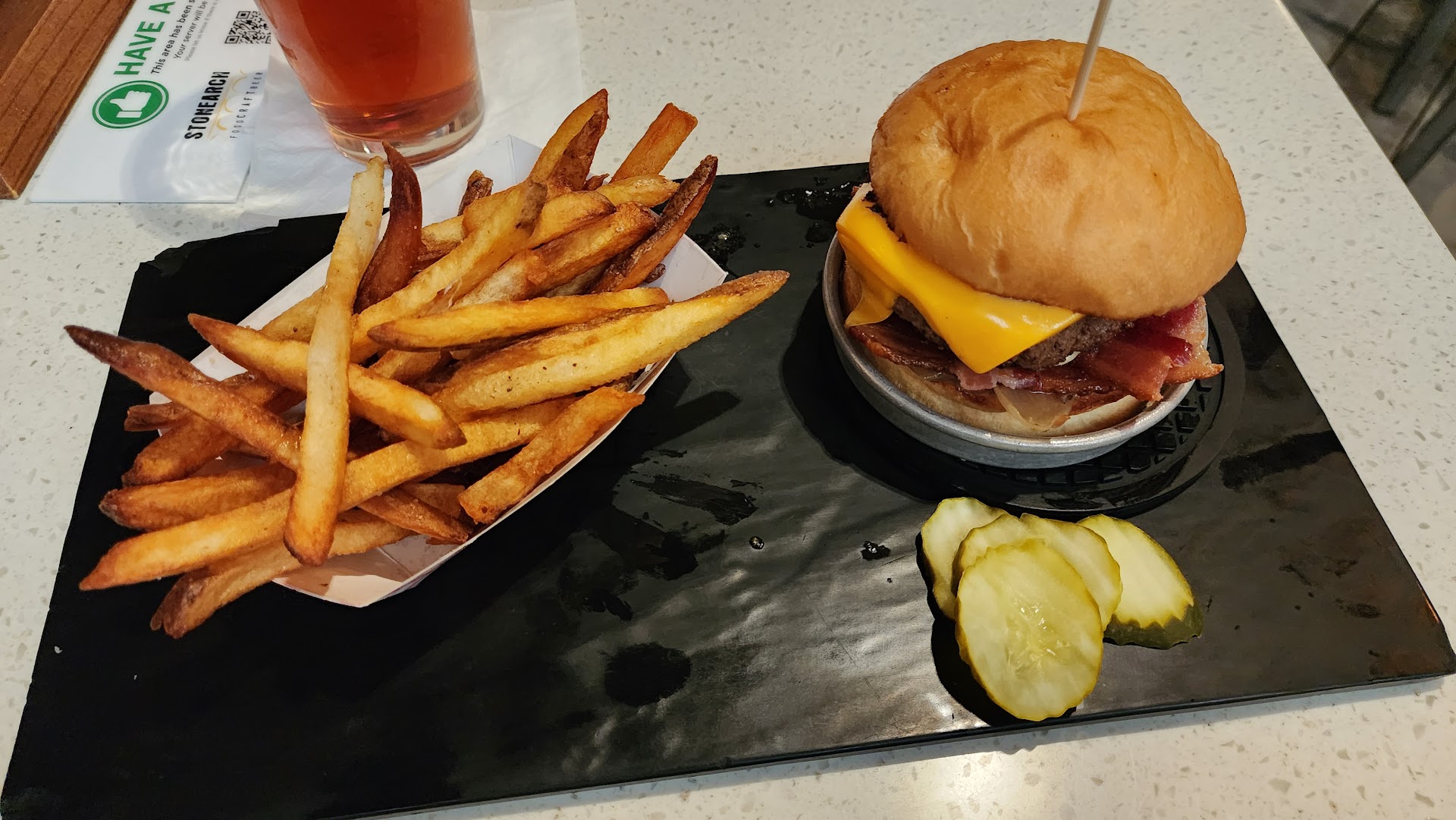 I ordered the stone arch burger, well done. It wasn't well done but I didn't have time to get it remade so 🫠. It also comes with sooooo many onions that it's unreal and hardly any cheese. The patty was tasteful but they served it in a round metal tin making it impossible to cut it in half to check for the doneness. Some would call it juicy. Others would say greasy. I will tell you the taste was actually really good.