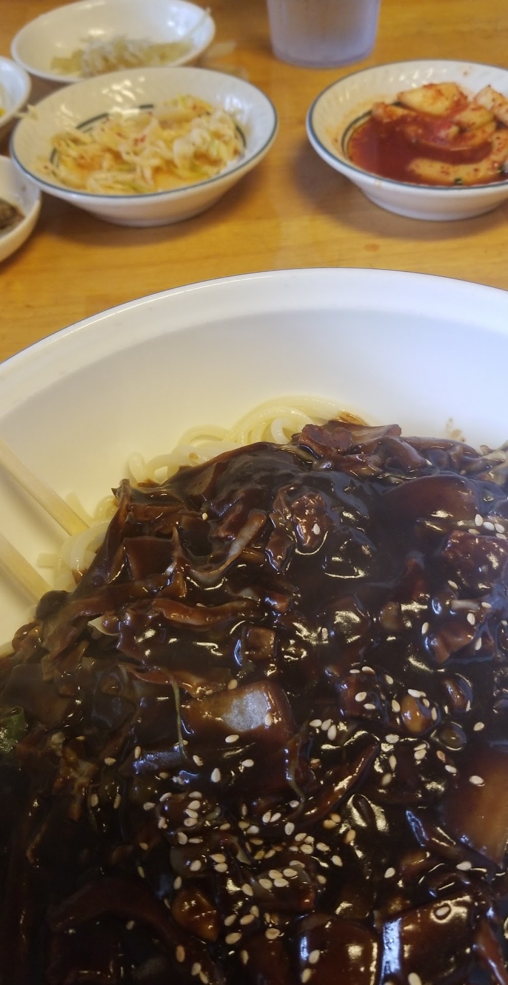 Upon arrival, the inside looks like it needs a little renovation, which we didn’t mind. The lady inside was nice. We tried to order sweet and sour chicken, but the lady said that they were all out of sweet and sour dishes even though it was 2pm. We settled for black bean noodles, stir fry squid dish, and kimbap, which the lady was hesitant to accept (she said something along the lines of ‘uhh, let me check’) but decided to accept the order