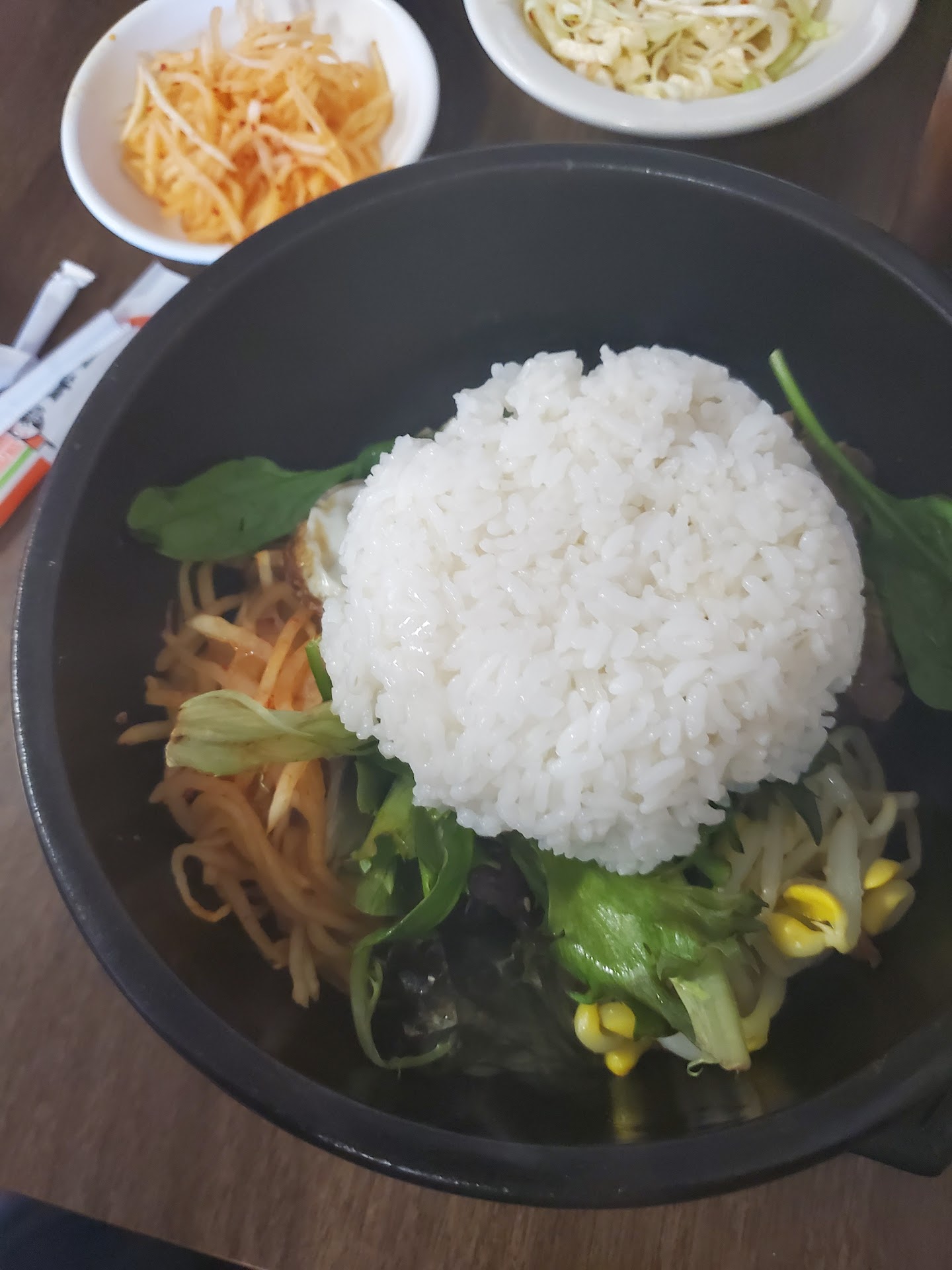 When the kimbap arrived, it was small cut of cucumber, pickled radish, spinach, and egg with a lot of rice. For an $8 roll, it was outrageous price. The kimchi was too fermented, almost gone bad and the lemon water that was served tasted like dish soap.