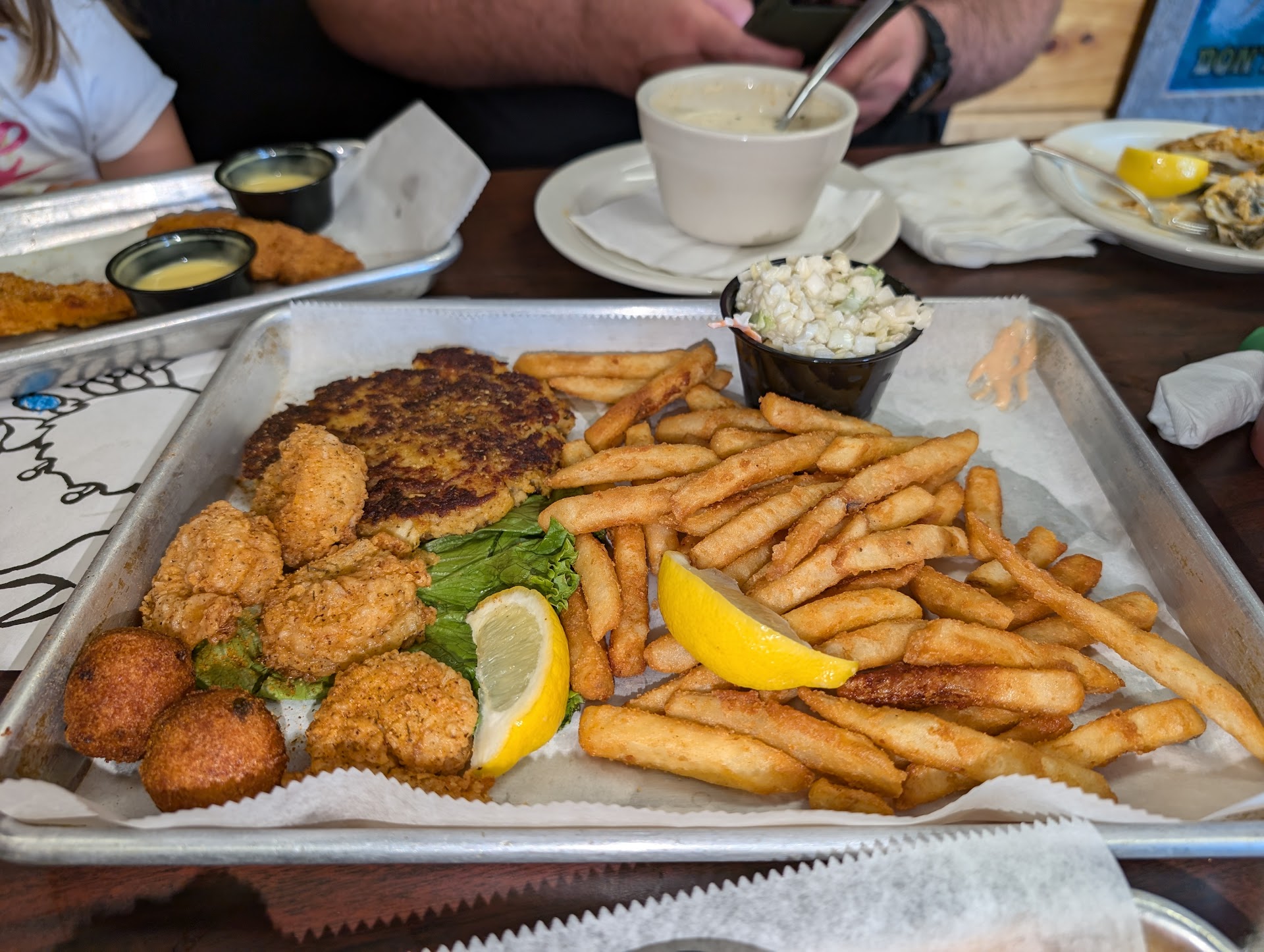 Crab soup was full of shells, $26 Parmesan grouper fish was supposed to be blackened, had no flavor and over cooked. First time I have ever seen my husband put tartar sauce on fish! The fact that they had a bottle of tartar sauce on the table should speak for itself⊠$14 Chicken salad was three small pieces of Walmart tenders, again over cooked, on brown wilted spring greens. They did sprinkle some bacon bits on the brown lettuce but I didnât try them. Crab cakes looked and tasted like the chef got a can of crab and smashed it flat. One waiter was complaining about his job to other guests and our waitress, good and attentive is the only reason I gave this review any stars. So many other delicious restaurants in the area donât waste your money here!!