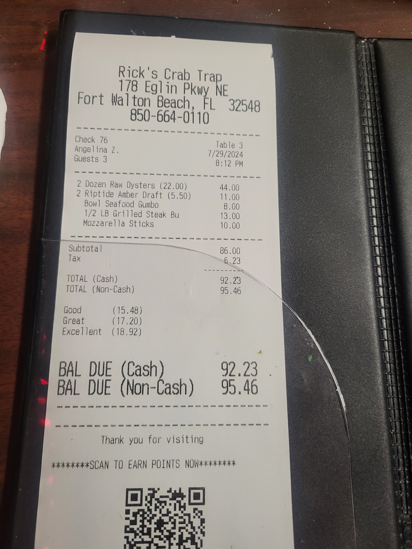 Read moreWe have always enjoyed eating at Ricks every year we come to Fort Walton for vacation, but tonight I felt like We were literally taken advantage of. We asked the waitress what the market price for snow crab legs and we were told $52 a LB…….we knew they were gonna be expensive but we all indulge when on vacation and spare no expense when it comes to crab legs, we accepted the price but we were NOT given the product! We were given 2 small clusters, which the legs were as around as my finger! There is NO WAY we got anything CLOSE to a pound of crab legs!!! I really wish I would have taken a picture before we ate but I did take a picture afterwards of the shells of my 1lb $52 worth of crab, anyone that eats crab legs will look at this picture and decide to definitely NOT order crab legs here. I understand the hardship the restaurants have gone through for the past year, but I did not complain of the price and I can afford to pay the price, but to cheat me of the full Lb that I paid for was really shameful. I told my waitress how we all felt and she apologized, she said she spoke to the manager/owner and there was nothing they could do……no one but the waitress came out to talk to us. I have never been so disappointed and felt so taken advantage of as we did...