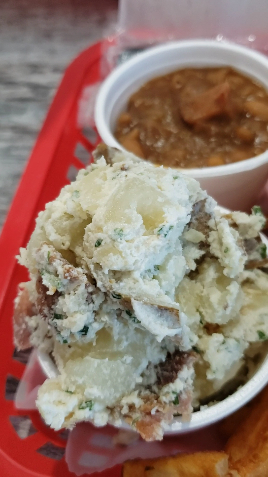 Don't get the potato salad. It was very dry and tasted awful. The baked beans were very good, with big chunks of meat. Portion size of the potato salad and the beans was very small in relation to the much larger burger and fries!