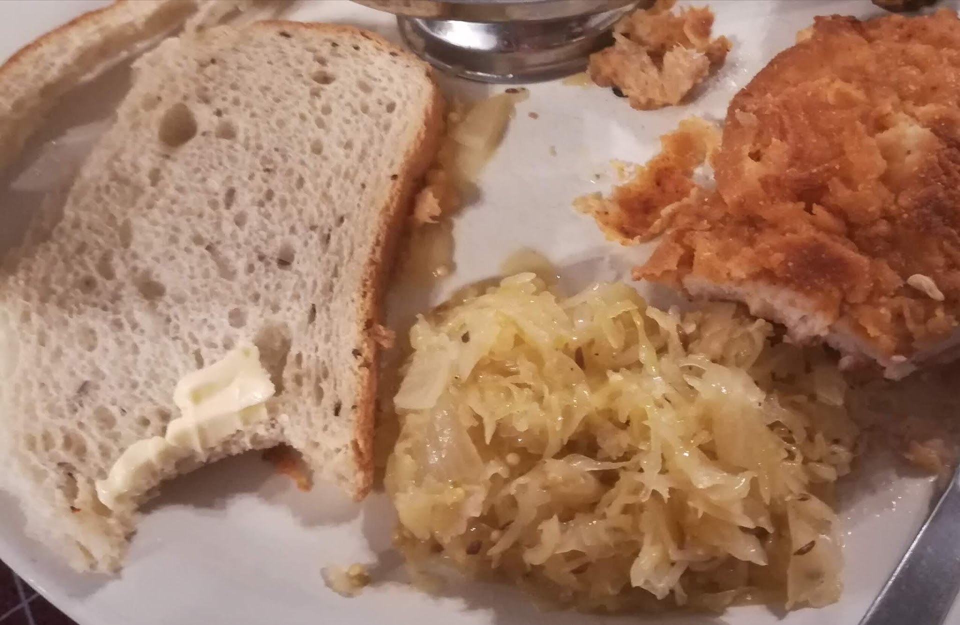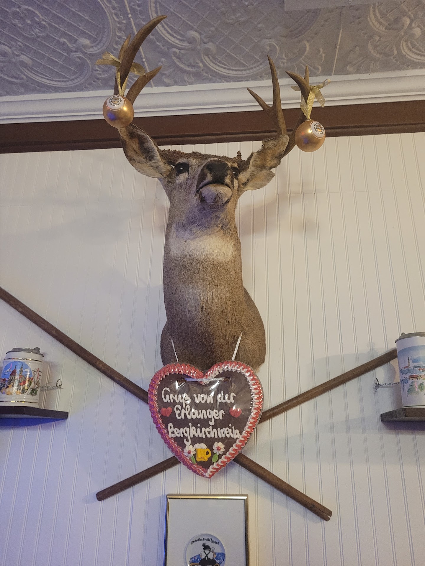 My spouse and I went to this restaurant for the first time on a Friday for lunch. While this was the first time, it definitely will not be the last time. We loved the place and can highly recommend it for a true German dining experience. I am almost all German by nationality and, although I don’t read, write or speak the language, I have had much German food over the years at a multitude of places, including our own kitchen where I am a very accomplished cook. My spouse is not in the least German and she has only dabbled around the edges of some German food I have prepared. I have seldom, if ever had authentic German food like we were served at this fine establishment. I am already looking forward to my next trip and my spouse is asking to go back soon. The restaurant infrastructure is nothing to write home about. Parking is limited, the lot is in rather poor shape and access to the sidewalk that runs in front of the restaurant is rugged and steep, although only a few feet long. I mention this because I am handicapped and use a wheelchair and getting to and on the sidewalk can be a challenge without some caretaker assistance. Once in the restaurant, the wheelchair accessibility is fantastic. It is a small restaurant with seating for maybe 60 but there are at least two separate banquet/events rooms/areas that can hold many more. That being said, even though smallish in size it is not crowded; the tables are widely spaced out and I had no problem wheeling around the room to check out the beer stein collections and other interesting pieces of décor. The atmosphere is warm and comforting with a lot of nice décor pieces, old style stamped metal ceilings and a long wood bar that is easily accessible and can be dined at if desired. Tables are roomy with plenty of room for full meals, side, drinks, etc. The staff is friendly and knowledgeable and very helpful in explaining dishes, working with special requests, etc. The owners are a husband/wife team and she was in the front of the house several times while we were there. The husband does much of the food preparation while she does quite a bit of the cooking. The husband is a German butcher by trade and he makes the bratwurst that is on the menu in-house, himself. Frankly, both my spouse and I thought it was the best bratwurst we have ever had. The bratwurst is also available for sale in bulk freezer packs to take home (10 to a pack) and we sure availed ourselves of that opportunity. Enough of the background and now onto the food: WE ordered a pair of brats for starters and asked to swap out the sauerkraut for a warm Brezel w/ “to die for” mustard. For my dinner I ordered a full breaded pork schnitzel with a heavenly creamy mushroom gravy that includes Porcinis and Chanterelles (the restaurant calls this the Jäger) and my spouse ordered the breaded pan-fried pork loin stuffed with ham and a mix of cheeses labeled by the restaurant the Cordon Bleu. Please be aware, these meat dishes are huge, each has two full pork loin slices and the amount of ham and cheese could be a meal by itself. Each dinner came with two sides and the side were rather hefty potions as well/ We ordered the Red cabbage, the Sauerkrat, the Noodles and the German potato salad for our 4 combined sides. Every side was good, although the potato salad and Red cabbage were milder than I usually encounter or make myself. My spouse really like both of these sides. I had planned on asking to taste the other gravies in little tasting sample sizes but got so tied up in how good the meals were that I forgot to ask. After we packed up our “to go boxes”, and there was plenty of leftovers to fill two boxes, and got an extra side of the mushroom gravy to take home for the leftover Jäger, we bit the bullet, even though we were very full, and split a warm Apple-strudel. Are we ever glad we did that. The strudel was excellent and begged for some ice cream so we added that as well.
