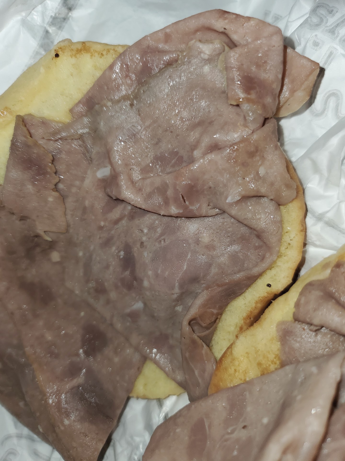 Sandwiches: I bit into the first one and it was more rubbery than usual. Those of us old enough to remember Arby's from decades ago know that the meat we're given today IS NOT THE SAME as we were fed way back when, back when it actually tasted like roast beef and wasn't an off-putting texture! But what I had today was horrible! I gagged down the rubbery sandwich, but the first bite of my second sandwich was immediately spit out! It tasted rancid and slightly chemically. You can see by the picture that the color is wrong, and it's...