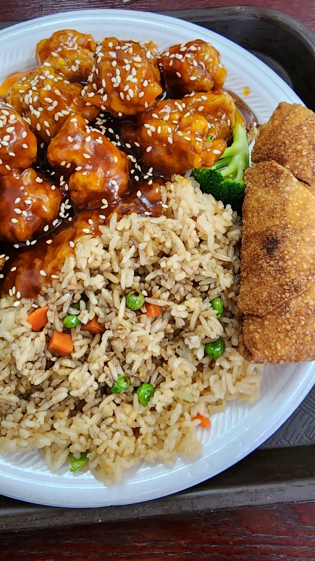 I ordered General Tso's chicken and my girlfriend ordered the shrimp char kway teow. The sauce for the General Tso's was on the mild side, not very spicy. Over all my dish was tasty but there was too much sauce and, in my opinion, it was a little thin. Having said this, I did not eat any of my rice and this probably would of taken care of my issues with the sauce. I just wanted to lower the carbs of my meal. If you use all the rice given, this is probably a non-issue. My girlfriend was happy with her dish. We also had the crab rangoon, which was ok, and a pork egg roll that was very good.