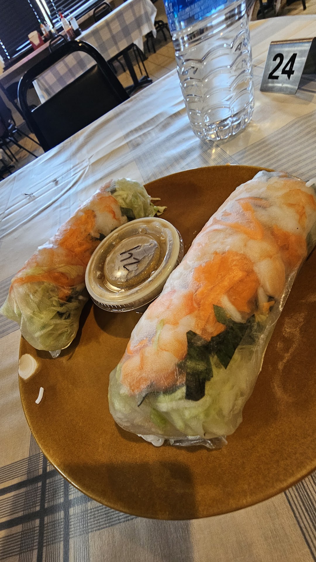 I very much enjoyed the pork and shrimp spring rolls. These things are huge! I probably could have just had this order of two for my dinner. The wrapping they come in is almost see-through and a bit sticky to the touch. It held inside a great variety of vegetables, shrimp and pork. I really enjoyed these and highly recommend them.