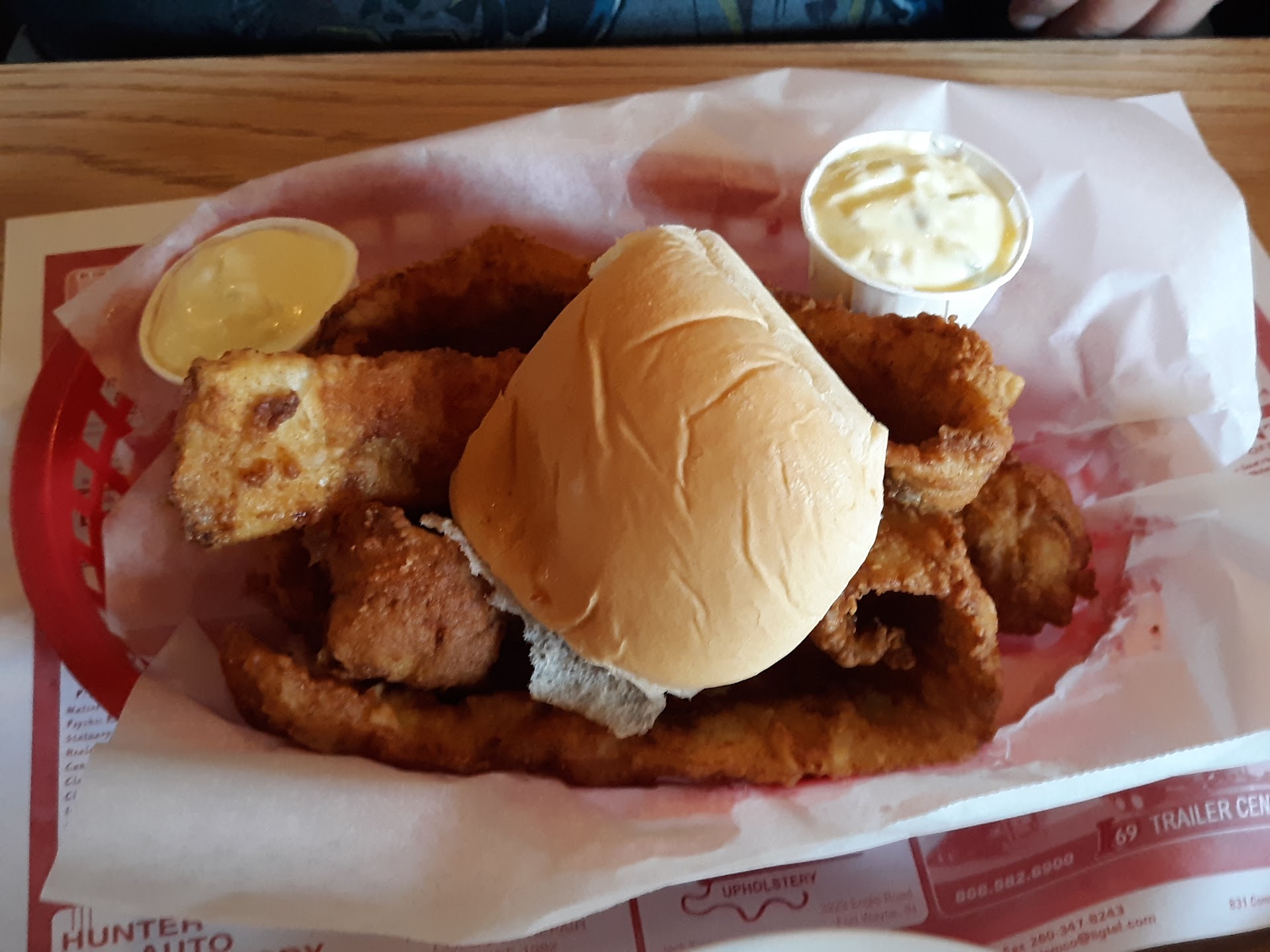 Read moreMaybe this eatery moved but when I got there I was confused by some of the reviews. I was of the impression that it was a hole in the wall. Its not fancy. Its like an old fashioned local eatery ought to be. There was a parking lot out back for a dozen cars. There were 6 or 8 booths, about a dozen tables and a bar that could serve another 10 people. The problem, I'm afraid, was the big eyed fish but here's the good part. I ordered the special, which was flounder because I like flounder. It came with 2 big sides. I chose green beans and wild rice and they were good. But the fish was overcooked and over coated. And it wasn't terrible. It was very good for what i paid. I told the waitress and she sighed that when they get it, it's processed that way. Ok. Honest enough. So next time, I'll skip the special and order whatever is fresh and ask that it be broiled, like another reviewer suggested. Bottom line is that for real food, with a beer, with real silverware, a clean table, clean bathroom and an attentive waitress for under $20 including a decent tip, I'll pass on McWhatever and be back here next time I'm in town and try again to give it another star. Besides, I took half of it home and ate it for breakfast so that gave me two bangs...