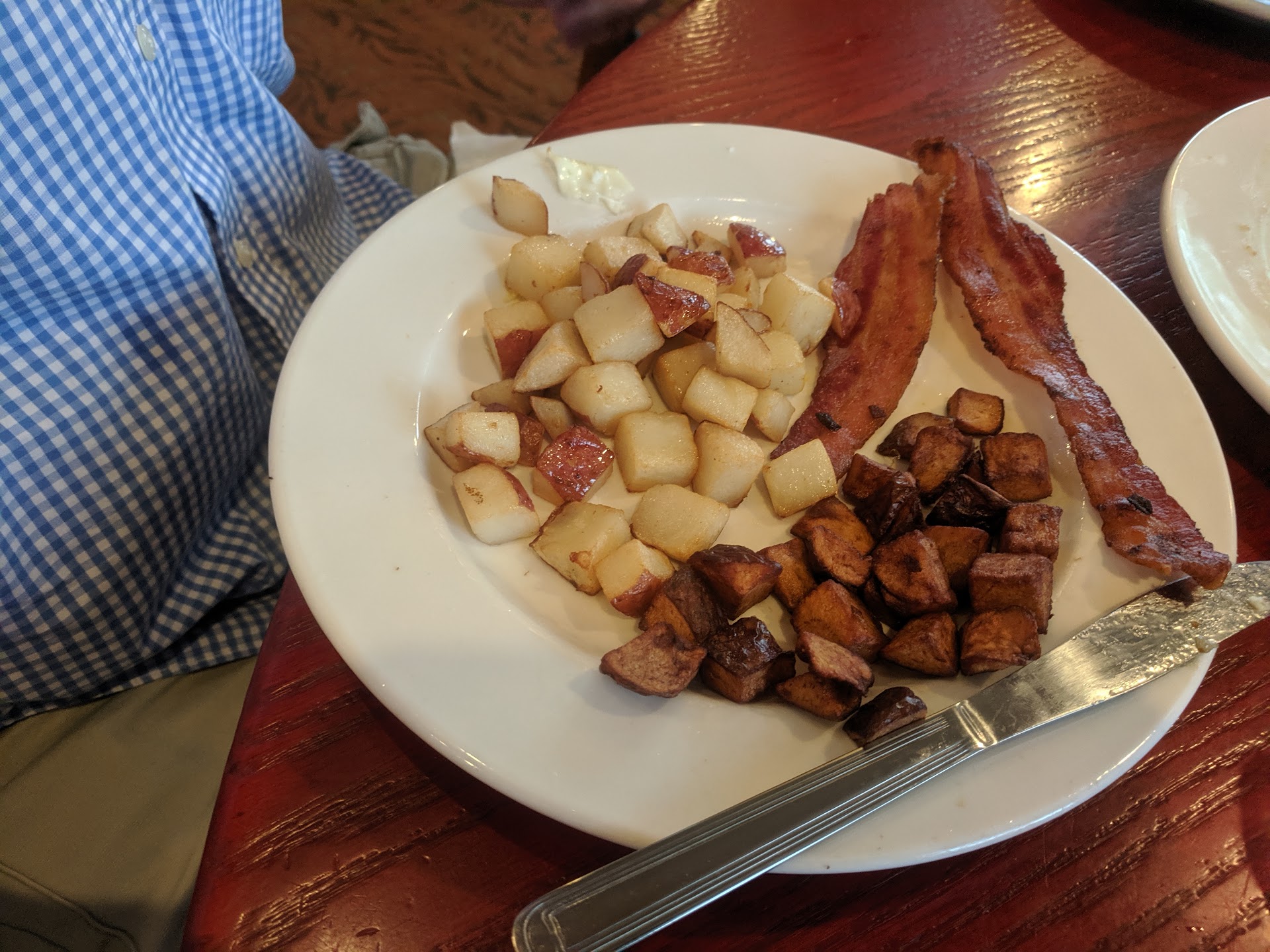 Met my parents here with my children at 11 am on a Sunday. It was busy but we were seated promptly and the table was spacious. However, we were not greeted by anyone at the table for almost 1/2 hour. I would chalk this up to overcrowding and understaffing except the waitress that eventually came to check on us was over at the 2 tables right next to us 2-3 times each so she saw us. she also took the order of a table that was seated about 10 minutes after us befire us. when she came over, she was very nice and got our orders right but the service was just slow. It took another 20 minutes to get drinks so 50 minutes in all. Then we placed the order for food and, again, very slow. In all, we were there for 1 hour and 50 minutes for a brunch that should've been 45-60 minutes, tops. Regarding the food, I ordered the Homestyle breakfast, biscuits w sausage gravy, 2 eggs, hashbrowns, and a meat. The hash brows were brown to a crisp-way overdone. The eggs were prepared paper thin. I don't even know how they did that but, regardless, when you go to the local Greek-run breakfast places, "2 eggs" somehow fill half a plate. These were 2 diet eggs, i guess....just wasn't much there. The biscuits and gravy were good. My son got a hot chocolate that was about 1/3 liquid and then a bunch of whipped cream. While he enjoyed that, it certainly isn't what he ordered. There were also supposed to be blueberries for the eyes on the kids happy face pancake and, they substituted chocalate syrup instead. (This is not a big deal in and of itself but the picky kid did not like). All in all, between the service and the food, not a great experience. It wasn't horrible but, as far as local breakfast options go, there are an assortment of...