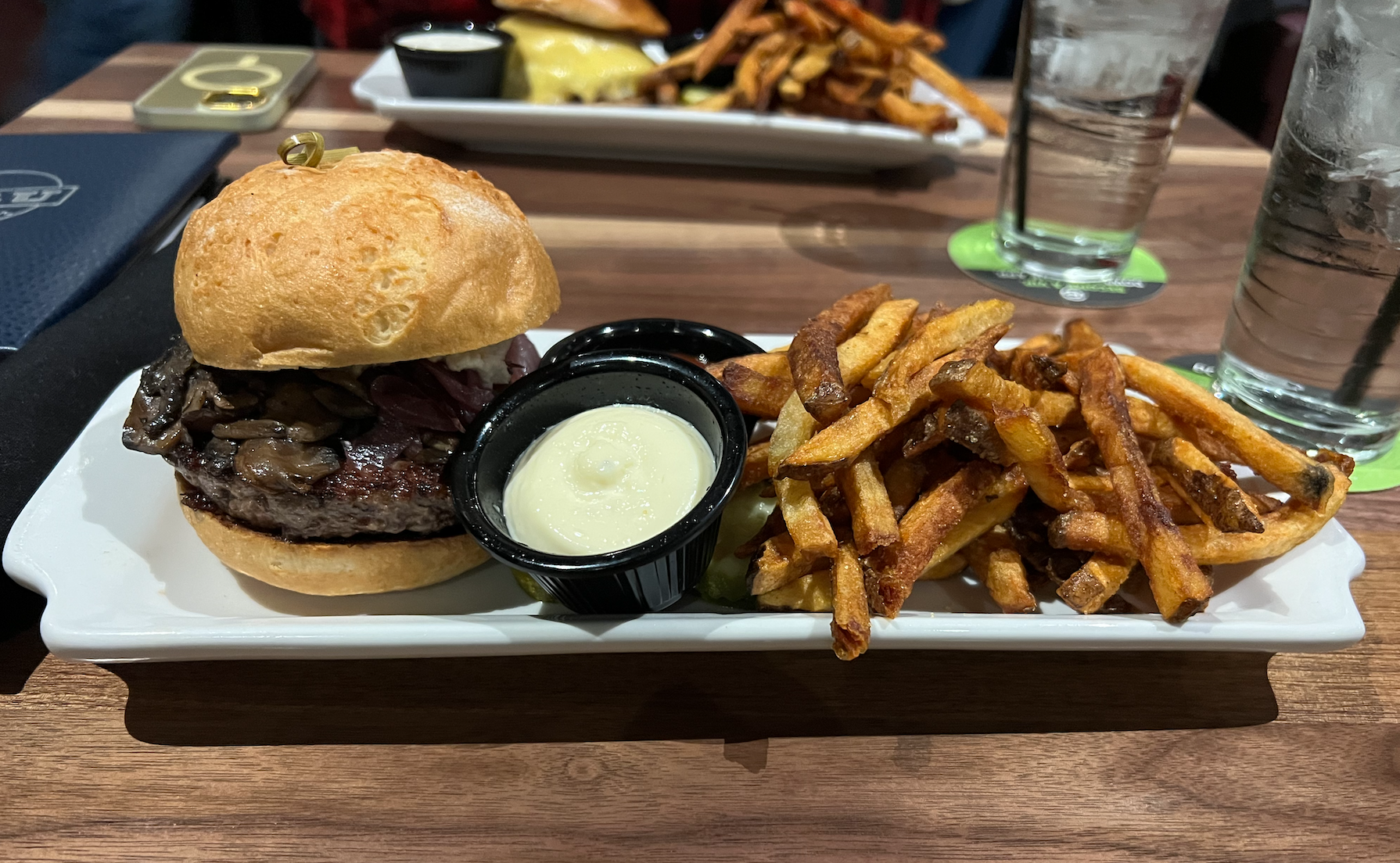 Brew burger is in the old blue Mountain Café location and they kept the same basic look. Really nice facility, large, and has quite a capacity for customers. They’ve also seemed to have done a nice job of getting plenty of wait staff on hand to handle the influx. One suggestion we could make is if they could get some sound baffles or acoustic panels to control the noise. By the time the place got crowded I couldn’t even hear my wife across the table from me. Every surface there is a hard surface so sound bounces around like there is no tomorrow.