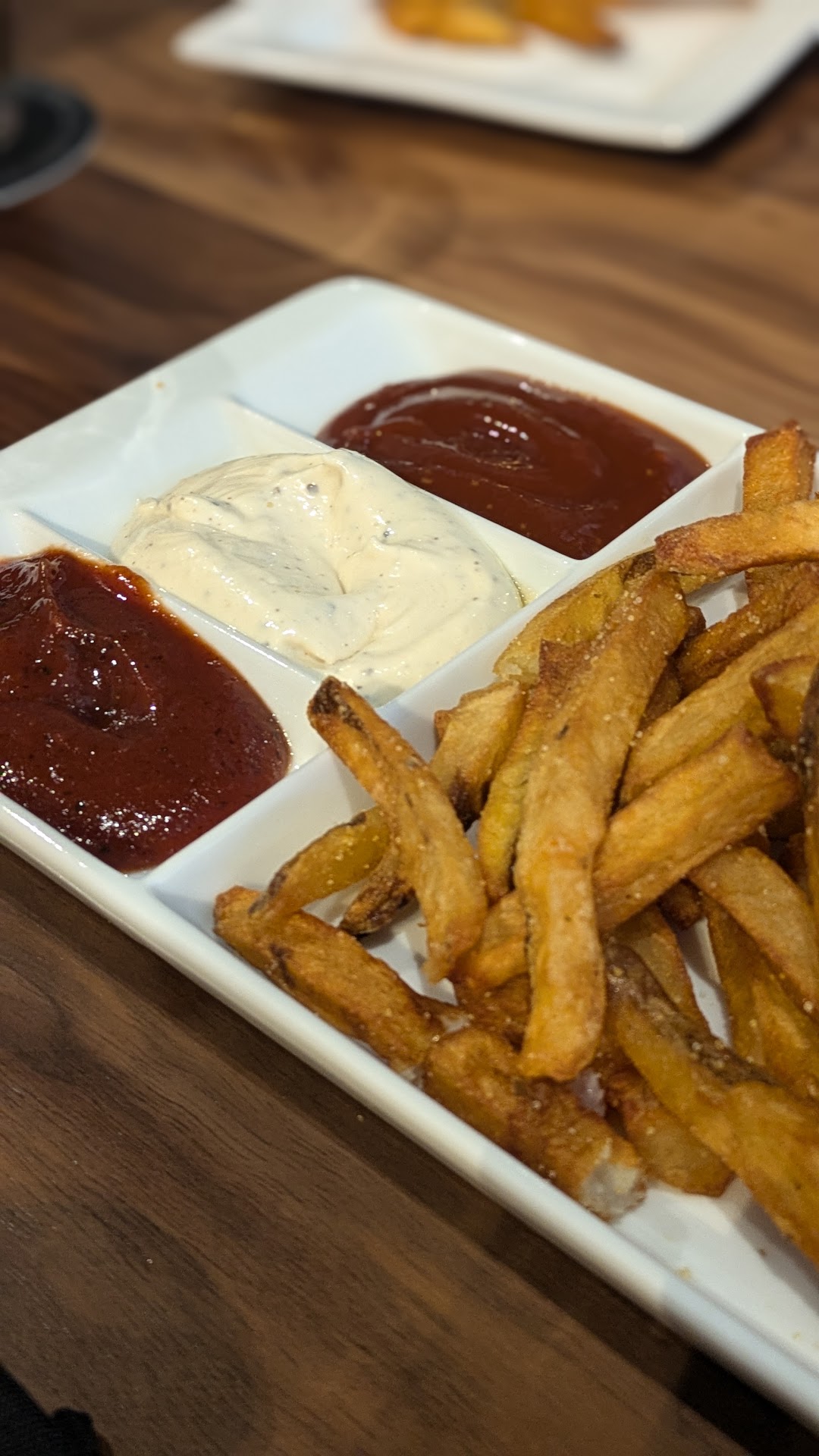 There were four of us in the group today and we started with an order of the Bru Fries. The dish is just that, a dish of fries but it comes with three sauces to dip the fries in. It's probably comfortably enough for two people plus the burger that you're going to get, but we managed to stretch this to four people so everyone could have a taste of the fries and all of the dips. It includes their house ketchup, pepper mayo, and a barbecue dipping sauce. I really enjoyed the House ketchup. I'm really not a fan of mayo on fries at all. I know I know being from the Midwest and all that's hearsay. The barbecue dipping sauce was okay but I preferred the house ketchup.