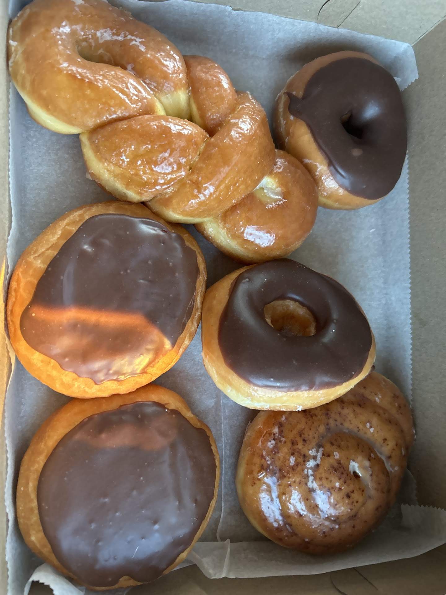 Great traditional selection. Very fresh and even though we got these on Saturday morning I had ONE left on Monday morning..two days old and STILL unbelievably good...better than a day old even...:)