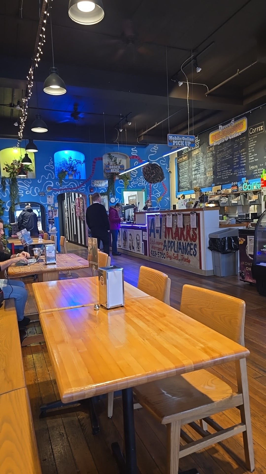 Read moreHaving a craving for an Everything Bagel, not a franchised industrial bagel, but a real chewy/crunchy toasted bagel spread thick with cream cheese, i decided to give Davey's a try since it is a small local business. Running short on time, i ordered and paid for the bagel on-line. That was easy, and I received the text notification that it was ready before i arrived at their shop. After struggling to find parking, I walked into the shop expectng to find my order waiting for an easy grab and go. Nope. I had to wait 7 minutes in line to pick up an order I placed and paid for 20 minutes prior. I'm not sure of the point in offering mobile ordering, if you still have to wait in an inefficient line. Mildly irritated since i was in a hurry to go to an appointment, it was finally my turn to pick up my much-anticipated bagel. It came out wrapped in foil and still warm. However, when I reached my car and unwrapped it, I was so disappointed. It had good flavor with the Everything Bagel seasoning and quality cream cheese, but the bagel itself was soft like bread, not the chewy mouthfeel of an authentic bagel, and definitely not toasted-- just warmed. Now I imagine with their other sophisticated menu offerings, the flavors would be great since they sounded creative and delicious and used local suppliers, but you would still end up with more of a sandwich experience rather than a true bagel experience. So if you want a great sandwich, you'd be satisfied, but if you want an authentic bagel, you should...