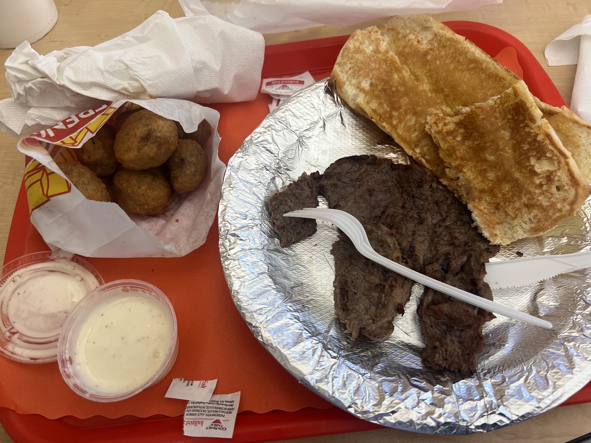 I’m not gonna lie… it’s been a while since I’ve left a review for a restaurant while I’m still AT the restaurant, BUT!!! My current experience inspired me to leave this place best review possible right away! I had the ribeye steak sandwich with a side of fried mushrooms and ranch. I got my French bread for the sandwich toasted with garlic butter. No toppings. And I ate the steak separate. They charbroiled the steak a second time for me because it got a little cold, but that perfected the flavor of the steak! I prefer it well done :) The fried mushrooms were sooo good! I couldn’t stop eating them lol and the portion was huge. My garlic toast was good. And the service??? Baby their customer service is excellent!!! I really appreciate that! Everyone on the staff treated me so nicely - it was refreshing. Last but certainly not least, the establishment is very clean! When I say I couldn’t find a piece of trash, a spot on a floor, a crumb on a table??? I MEAN that. Excellent, praiseworthy experience! Thank you Georgios King Gyros! This will now be my new gyro spot (even though I haven’t even had their gyros yet lol). In short, you won’t regret...