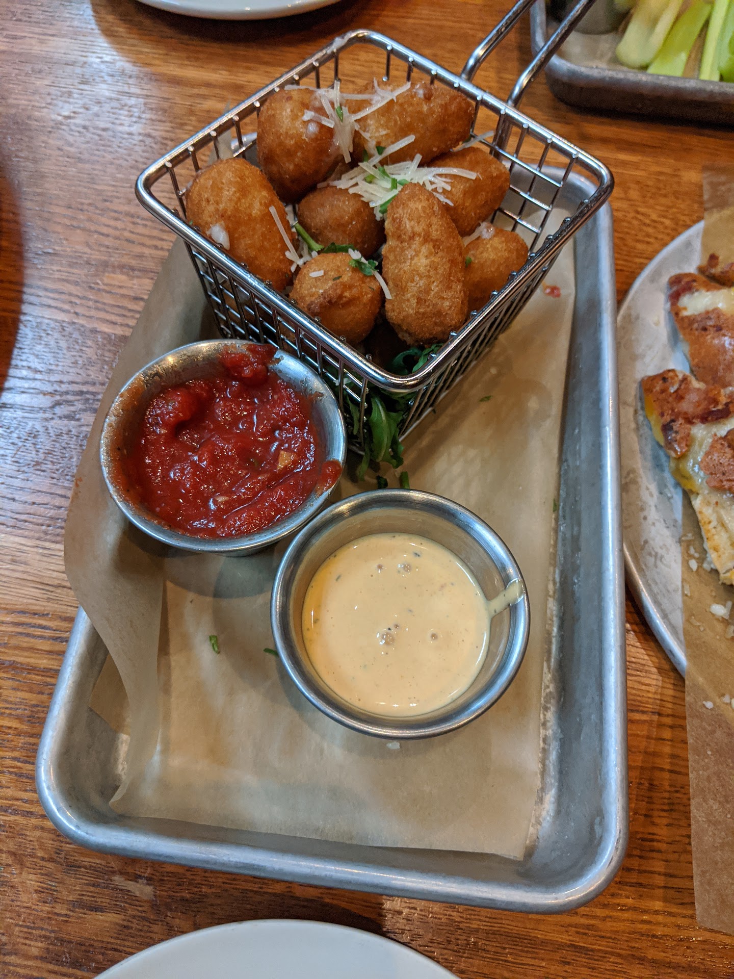 I had the meatloaf. It was a decent portion of under-salted meat that was slathered in a bottled sweet-n-sour sauce they called “bourbon onion gravy.” Maybe it’s because I lived in KY for more than a decade, but I couldn’t make out any bourbon or onion…just diced canned peppers & high fructose corn syrup. Of the 12 green beans served with my meal, one had the stalk still attached! Because of the odd construction (bread, gravy, beans, meatloaf, mashed potatoes, & topped with onion straws) I couldn’t see it so I had the delightful experience of biting into a twig. Thankfully, the undercooked lumps of red potato in the “mash” were there to distract me from the disaster which lay underneath.