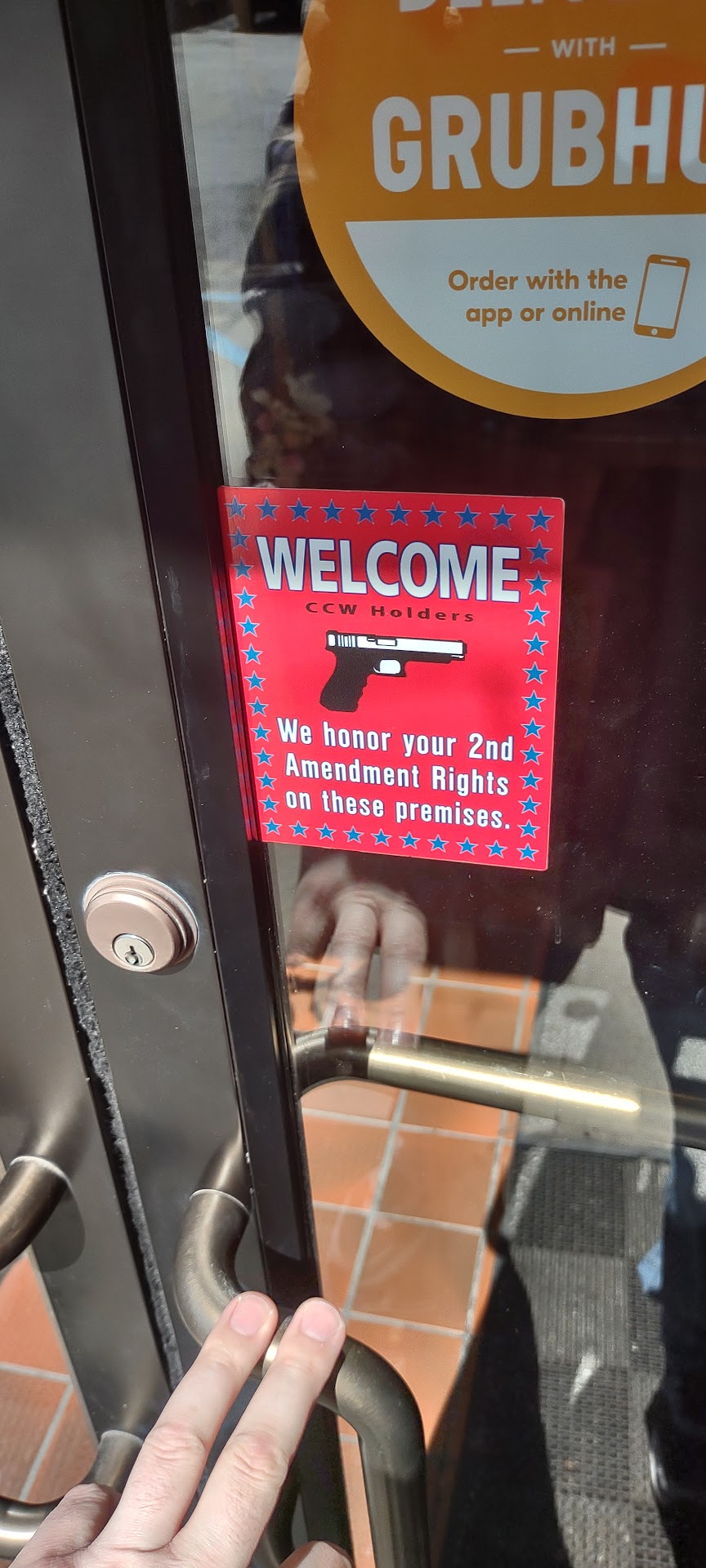 Specifically for the biggest reason that needs to be on every single restaurant front door in order for me to go, is that they THEY SUPPORT YOUR 2ND AMENDMENT. It's sad that they even have to have a sticker on the door stating you're welcomed to CCW as I believe it should be welcomed every where. I DO NOT go to places that are gun free zones. I wish more stores and restaurants woke back up from their long nap and smelled the coffee because this is our God given American right to have and I support them because they support me.