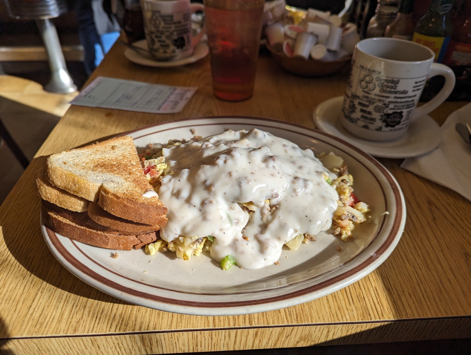 Read moreI'm giving it a 3 because my daughter liked it. This was our first time here. Food was fine, but not good enough that I'm gonna come back. It was busy, so we took the only available table... Tables are for 2 people and definitely crowded... 4 bottles of hot sauce, large sugar, sugar caddy, jelly caddy, salt and pepper, Ketchup, mustard, 2 cereal sized bowls of cream.. .Way too much for size of table..i wasnt even sure it was a table to be used... I thought maybe they just stored everything there. But nope. My daughter knocked a hot sauce down and the servers just glared at me.. Idk the servers name bc she never introduced herself.. And the pie cooler is right over this table so be prepared to be reached over if you sit here.. This place has been around a long time and stays busy, but not the place for me..i will continue going across the street to...