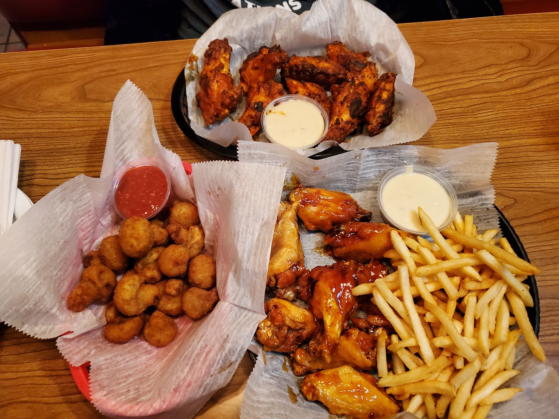 The issue we had was relating to their sauced wings. Weâve always got the naked wings in the past, which are delicious, but someone in my party got sauced wings this time and was presented with burnt wings - the things had scorch marks all over âem. Naturally, it wasnât very appetizing and was definitely not expected. The other members in our party had perfectly cook naked wings. So, we get the attention of a woman who was running out food and such to explain that my friend really couldnât eat them because they tasted burnt. Her response was that the wings are just cooked like that. Theyâre supposed to be burnt and that she could get the kitchen to put more sauce on them. Now, maybe itâs just me but that struck me as a cuckoo land response. Sauce wonât fix burnt. People arenât gonna eat burnt mashed potatoes if you put some gravy on âem and my friend doesnât want burnt wings - but wetter.