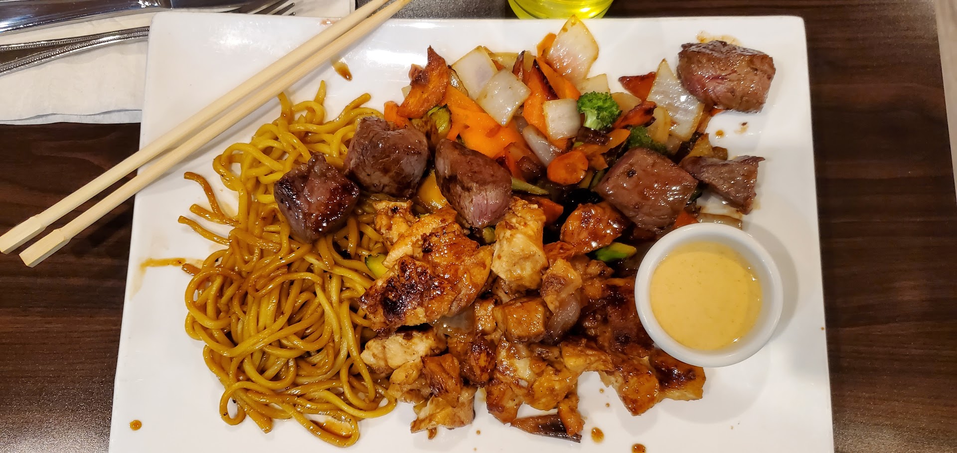 Ok, on to the food. Miso soap was hot (°F) and tasty w/ fresh oinions. The Hibachi chicken & steak was ok. The steak cubes were not uniformly cut so the insides were not cooked to the same level. Flavor was ok and temp was hot. Chicken was a little dry and pieces needed to be cut a little smaller (more bit sized) but flavor was also ok and temp was hot. Something was missing from the flavor. MSG? Lomein noodles were perfect. Vegetables...those pesky carrots. Some were cut too thinly and ended up getting over cooked and had a soggy leather texture. The onions and broccoli were fine. That dipping sauce was not my favorite. Sort of a watrered down mayonnaise. Needs replaced. Overal quantity was sufficient to allow for some leftovers. Drink refills showed up as we needed them.