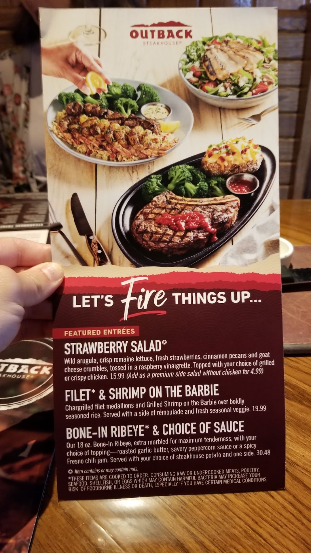 Previously, I'd never had a problem with Outback. I hadn't had much opportunity to eat their food, but when I did, I found it to be flavorful and filling. Not to mention, generous when it came to the portions. Price? Hmm fair-ish for the kind of food that was being served and the ingredients that were being used. I can't say I remember much about the wait time or staff, but from I do remember, it was always busy, and consistently short staffed. To me, not always a deal breaker if I'm in good company, the establishment is clean, the atmosphere is pleasurable, and the food is worth the wait...to an extent.