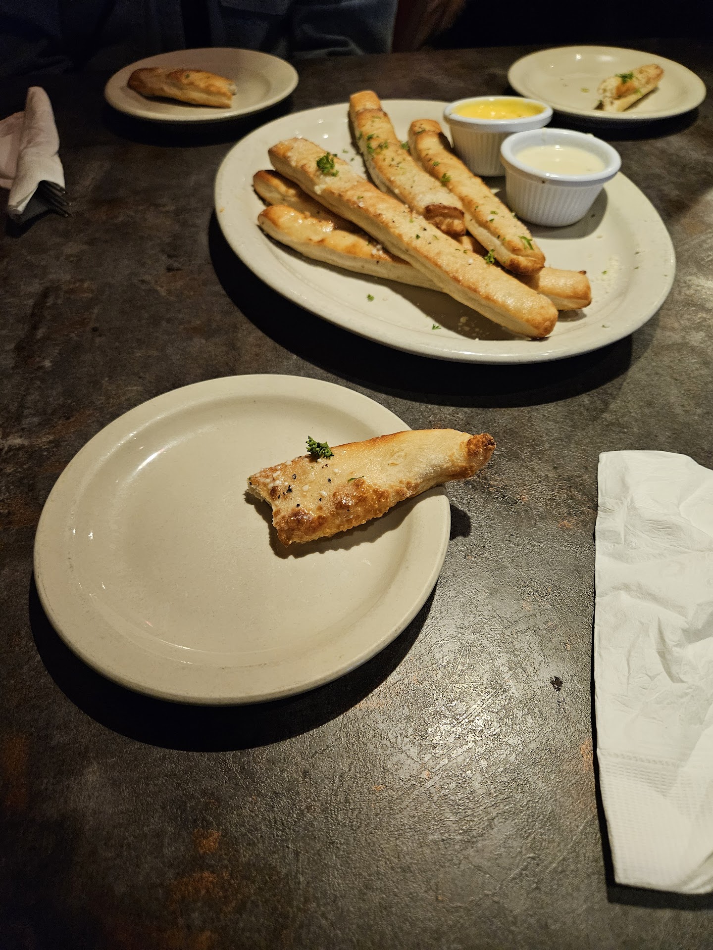 Ā Ā Ā Read moreI've been to this establishment a few times. I've orded through Door dash, I've picked up and have eaten in. The best thing they have is their sausage rolls. They are large and full of sauce and sausage. They bake it golden brown. Throw a little pit of garlic bitter on it and the parmesean and its just wonderful. The cheese bread and bread sticks are really good. I've had their Alfredo a couple of times. The first time was a family size pick up The chicken was grilled and was juicy. The pasta and sauce was great. Eating in was a let down. Maybe it was because we came in at 8:30. But the bf and I both irder the Alfredo, mine with chicken and his with salmon. The salmon was well. My chicken was not. You could it was frozen and boiled. There was no flavor. It was hard to even find it because it matched the sauce. The sauce was clumpy and unappetizing. I don't know if they have different staff working in the kitchen, but my suggestion is getting the baked items. Those always seem to come out really well. I know locals love this place, but they must be only getting the baked items. The atmosphere is quaint. I like the how the structures parcel off tables and dims the noise so you can actually talk to your table. The stained glass gives a nice glow from the bar area. The staff is really accommodating. They are pleasant and professional. The gal we had seemed a bit overloaded with tables, but I'm sure they are understaffed like other places. Pricing is on par for what you get. You do get a lot of food! You can make reservations here and is highly recommended during peak dinner times...