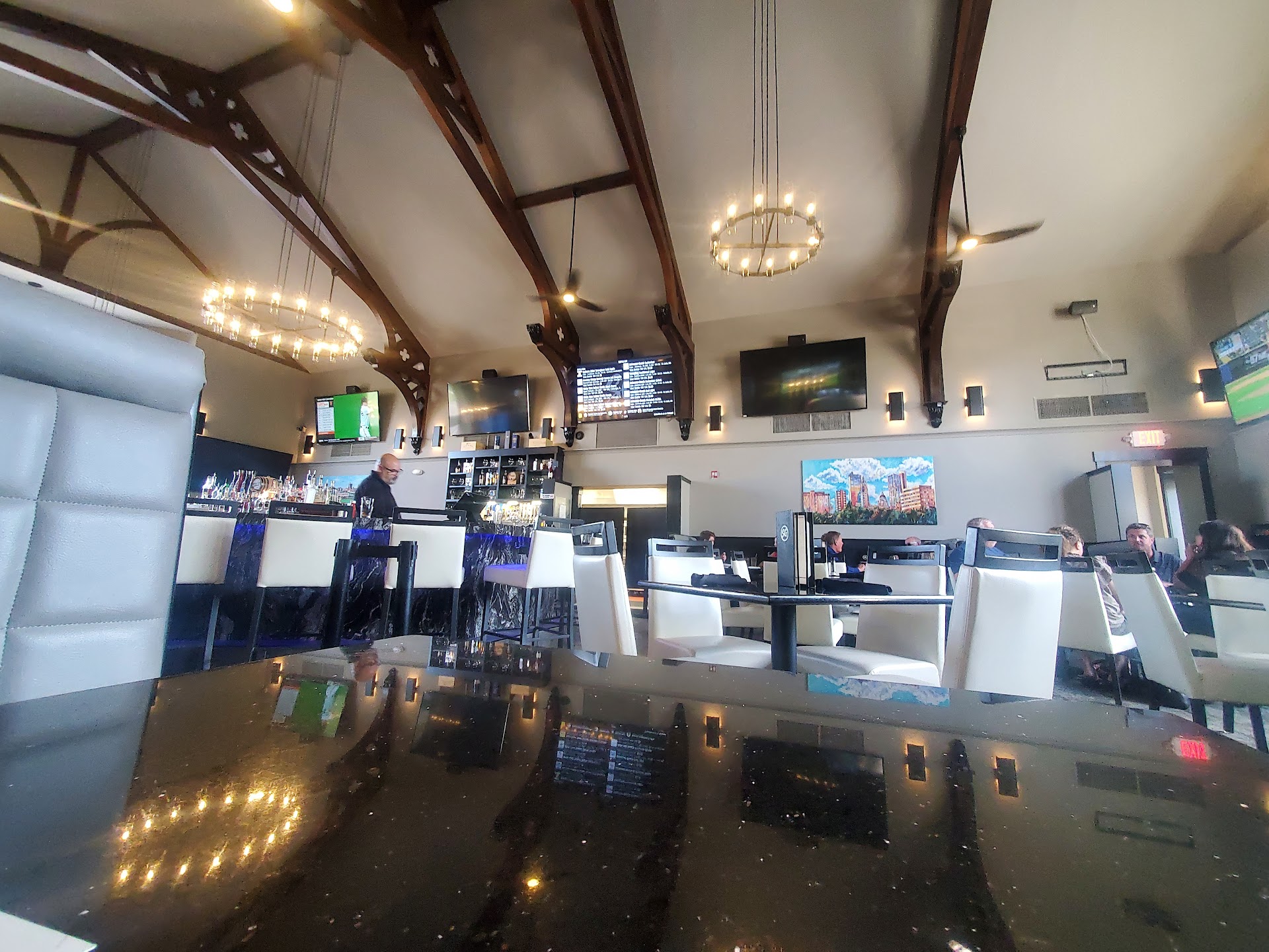 So, having read reviews and seeing the menu online my wife and I came for dinner. (First let me say, my next statement is made in good humor. True in my eyes but good humored.) It looks like 1985 Miami Vice threw up in here. Seriously had marble bar, white chairs and glitter black tables. Talk about going back. Retro is in I hear. They weren't very busy during our visit. We almost left prior to our server coming as we just sat there for what seemed like a very long time. Anyway, placed our order, if you brave the 80's I do suggest the pretzel. It was great. I had the Beast Burger and my wife had French Onion soup and a salad. While the burger was good it was over cooked. I ask for pink I expect pink.... No pink at all. The egg on the burger was runny and personally I would've preferred it fried hard. But the plate..... The plate was so small that if I say my burger down to get a drink it was in egg runoff and grease. The burger was CRAZY greasy. Fries were good. Wife said soup was great and the salad was "Meh". Overall it didn't meet my expectations. Since going we've spoke with another couple whom had a similar experience. Finally the price. $17 or $18 foot a burger and fries was a bit high in my opinion. We'll probably not go back. It was a chance we took and it just wasn't for us. But that 80's theme..... Oh my!