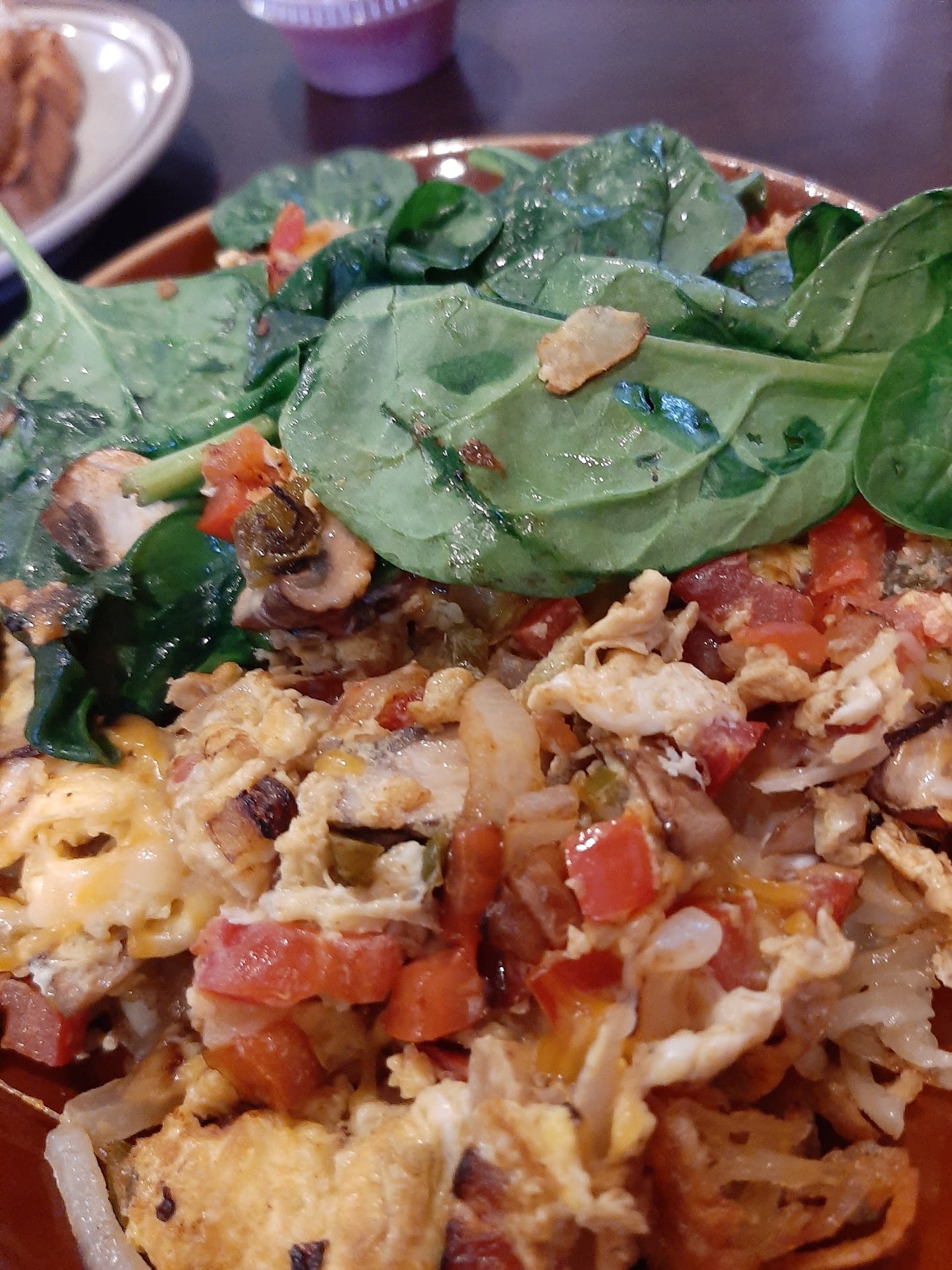 EDITED TO ADD: Husband got 'food poisoning' from his meal. He got very ill, diarrhea within a hour after eating here. He was very sick all day, and all weekend. Severely diarrhea. (Origional review)~Ate breakfast here. We would return, despite the low rating we gave. One of us ordered a skillet meal. Ordered veggie one with cheese. The amount of onions used was overwhelming. It tasted like fried onions. Thats the only flavor it had. Very heavy on that. There was less than a drop of cheese, basically none. The hashbrowns were cooked in with the eggs, not a big deal in itself. But add that there were way too much onions, and basically no cheese. And then in stead of the green peppers, they substituted spinach. But didn't saute it into the meal. Just put some leaves on top. Umm, ok. I did tell the waitress I wasn't happy, she didn't offer to have it re-made. Did discount the meal a couple of bucks, but I'd rather it was remade. Toast was burnt all around the edge,(actually black) and they put that piece under a piece that was toasted ok. I guess to hide it? Waitress was fast, did her job ok. Just would've rather had the meal replaced. Now I know to say lite on onions, and need to add extra cheese to just get what other restaurants would call...