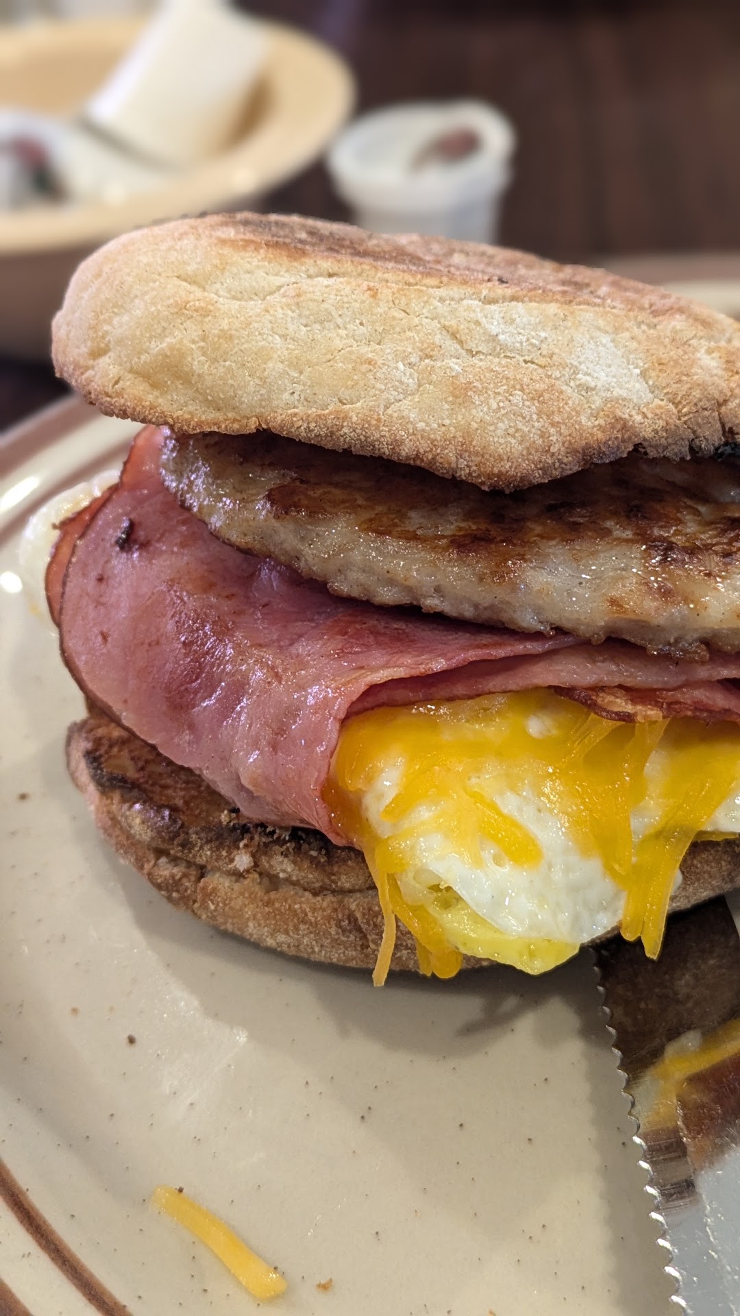 I took the opportunity to visit the restaurant as well and the skillet sizes are reasonable and the ratio of toppings to potato is skewed toward the toppings. I like the fact that the skillets are not swimming and potatoes. I had the breakfast sandwich which I'm not sure is on the menu but they were able to make it for me. I ordered it on an English muffin with sausage and ham, two eggs which I chose to have over hard instead of scrambled, and I chose cheddar cheese. The meat on the sandwich was very flavorful and the grilled English muffin was an excellent choice. I highly recommend any of these dishes for an...