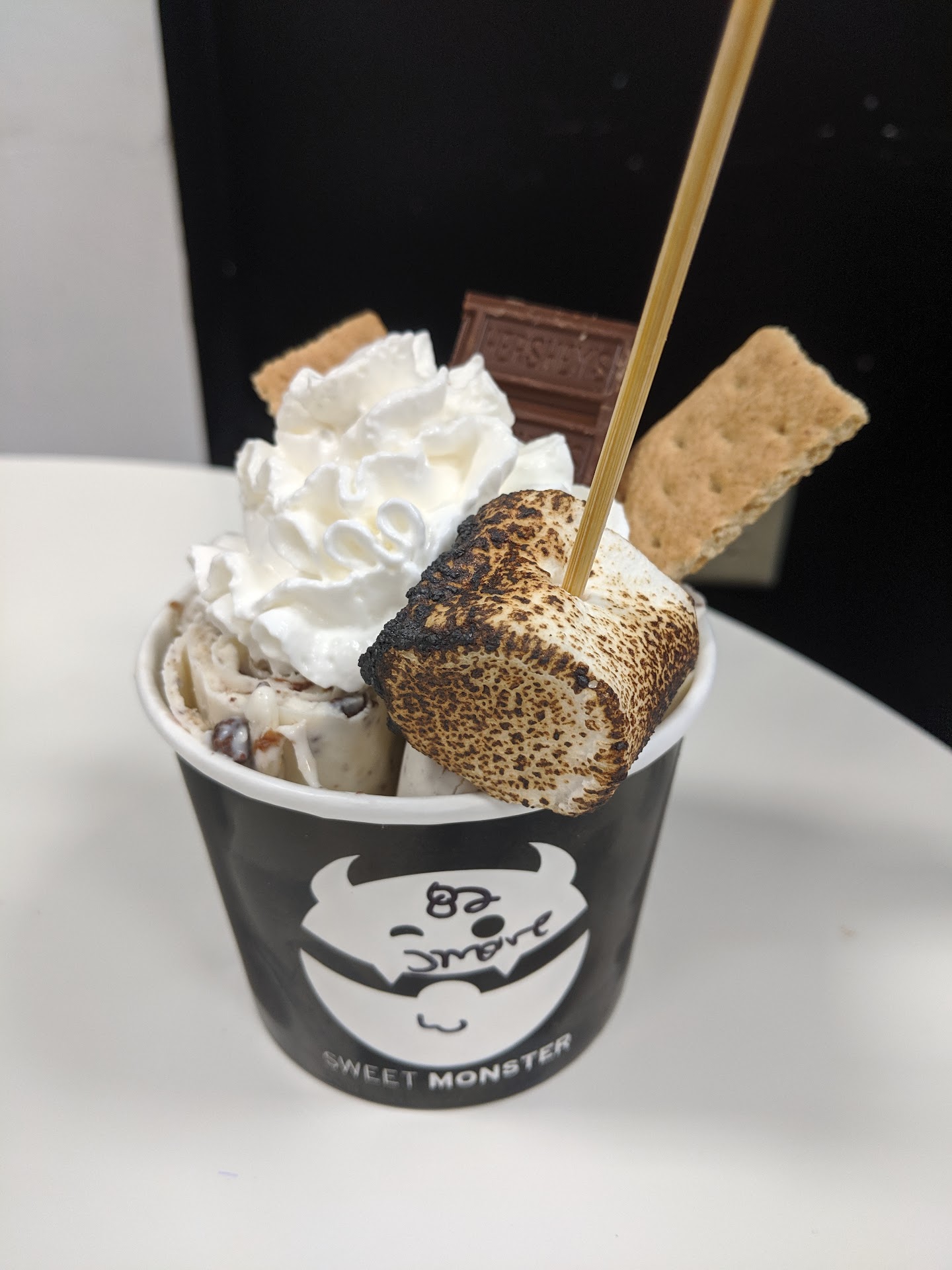 Upon walking in, my pal and I were struck by how loud and echoey the shop is. The decorations are also extremely bland, mostly simple black-and-white images, as well as a cringey quote about how diets are made to be broken. With a name like Sweet Monster, one would expect such a place to have more vibrant, colorful, and creative decorations. Where's the giant mural of a monster or group of monsters delighting in delicious rolled ice cream? Or if not a mural, a framed painting copy that can easily be replicated at other branches (I'm unsure if this restaurant is a chain, but it gave off heavy chain vibes). The employees seemed cheerless, which is no surprise in a place with such a lackluster atmosphere and what I imagine pays in pennies; I also overheard two of them mention how with the AC on in the summer, it gets too cold, but turning it off makes the shop too hot.