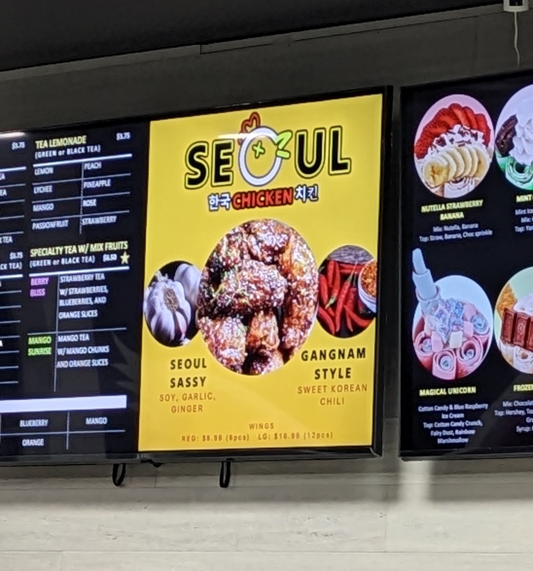 Read moreWow, my initial review for this place was seriously lacking. I am glad I got the chance to get back. Let's begin with the fact that right in the middle of the menu for ice-cream and shakes there is a section for...wait for it...CHICKEN WINGS from Seoul Chicken! Are you kidding me? We were so confused that we HAD to order some. I mean what does this mean?!? Wings at an ice-cream place. Let me tell you that they were some of the best wings we have ever encountered. We ordered 12 of the Gangnam Style wings and they were amazing. The wings themselves were good-sized, meaty wings and the breading/fried-ness was immaculate. THIS ALONE might bring me back to try the other kind of wings available (Seoul Sassy). SO, onto the Ice-cream. The treats here are very well done. The ice-cream and add-ins are very flavorful and created expertly. Let's face it though you are paying a premium for all of the labor that they go through to prepare your dish. Not only are you paying the price in the cost of the dish but you are paying the price in the time it takes to make each one. If you have more than a couple orders or if it is busy, you will be waiting a while. There was only 1 person working when we visited and bless her heart she did a fantastic job. Overall, I would say this place has really good ice-cream creations and great-tasting ice-cream. If you are looking for a unique ice-cream dish this is your place. Be aware that that the seating atmosphere is dismal. There are a few cheap outdoor-style tables with backless stools to sit around. Seating for maybe 20 in the small space. Good luck enjoying your ice-cream if the place is packed and there is a long line. Maybe plan to eat it in the back of...